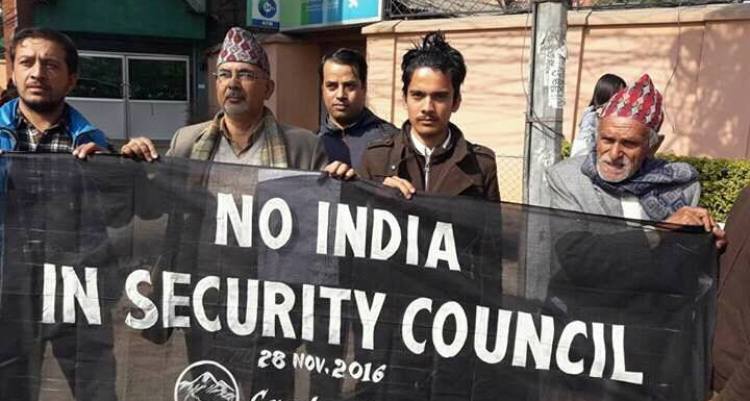 \"no-india\"काठमाडौं, १३ मंसिर । ग्रेटर नेपाल राष्ट्रवादी मोर्चाले भारतलाई सुरक्षा परिषद्को स्थायी सदस्य दिन नहुने भन्दै संयुक्त राष्ट्र संघमा ज्ञापनपत्र बुझाएको छ । मोर्चाका संयोजक फणिन्द्र नेपालले सोमवार काठमाडौंस्थित राष्ट्रसंघको कार्यालय पुलचोक पुगेर भारतलाई सुरक्षा परिषद्को स्थायी सदस्यता नदिने आग्रह गर्दैै ज्ञापनपत्र बुझाएका छन् । ‘‘नो इण्डिया इन सेक्यूरिटी काउन्सिल’ लेखिएको कालो ब्यानरसहित राष्ट्रसंघ कार्यालय पुगेको टोलीले यूएनको नेपाल उपनिर्देशक रामबाबु शाहलाई सोमवार ज्ञापनपत्र बुझाएको हो । ज्ञापनपत्रमा भारतलाई सुरक्षा परिषद्को सदस्यता दिन नहुने कारणसमेत उल्लेख गरिएको संयोजक नेपालले बताए । मोर्चाको ज्ञापनपत्र बुझ्दै यूएन प्रतिनिधि शाहले ज्ञापन पत्र सोमवार नै केन्द्रीय कार्यालय पठइदिने आश्वासन दिएका छन् ।