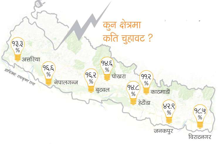 काठमाडौं, २८ मंसिर । विद्युत् प्राधिकरणले चुहावट नियन्त्रण अभियान सुरु गरेको दुई महिनामा करिब तीन प्रतिशत नियन्त्रण गरे पनि अझै एक अर्ब आठ करोड युनिट बिजुली गायब भएको छ । औसत बिक्री मूल्यका हिसाबले यो चुहावटबाट प्राधिकरणलाई ठाडै नौ अर्ब ३० करोड रुपैयाँ (प्राधिकरणको वार्षिक घाटाभन्दा बढी) नोक्सान परेको छ । आजको अन्नपूर्ण पोस्टमा खबर छ– प्राधिकरणको वितरण तथा ग्राहक सेवा निर्देशनालयले सोमबार तयार पारेको आँकडाअनुसार जडित क्षमताका आधारमा प्रणालीमा हाल स्वदेशका निजी क्षेत्रले उत्पादन गरिरहेको दुई सय एक मेगावाट बराबरको बिजुली चुहावट भएको छ । यति बिजुली उत्पादन गर्ने आयोजना निर्माण गर्न अहिलेको मूल्यमा ३० अर्ब रुपैयाँ लाग्छ । लुकाइएको बिजुली सर्वसाधारणलाई वितरण गरेर देशलाई लोडसेडिङमुक्त प्रायः बनाएको प्राधिकरणले विद्युत् चुहावट नियन्त्रण अभियानलाई तीव्रता दिएको छ । प्राधिकरणले तीन महिनाको अवधिमा वितरणतर्पmको कुल विद्युत् चुहावटमा २.०८ प्रतिशतले घटाउन सफल भएको ऊर्जा सचिव अनुपकुमार उपाध्यायले बताए । प्राधिकरणको प्रणालीमा एक प्रतिशत चुहावट नियन्त्रण गर्नु भनेको चार करोड ६५ लाख युनिट बिजुली जोगाउनु हो । यसअनुसार गत असोज र कात्तिकमा प्राधिकरणले साढे नौ करोड युनिटभन्दा बढी बिजुली चोरी नियन्त्रण गरेको छ । प्राधिकरणको औसत बिक्री मूल्य प्रतियुनिट ८ रुपैयाँ ६० पैसाका हिसाबले ८३ करोड रुपैयाँभन्दा बढी राजस्व असुल भएको छ । गत वर्षको आँकडाअनुसार प्राधिकरणको कुल विद्युत् चुहावट २५.७८ प्रतिशत छ । यसमध्ये वितरण लाइनमा चुहावट १९.८, प्रसारण लाइनमा ४.८२ र उत्पादनमा चुहावट १.१६ प्रतिशत छ । प्राधिकरणको वितरण तथा ग्राहकसेवा निर्देशनालयका अनुसार यस वर्ष ४।२७ प्रतिशतले चुहावट नियन्त्रण गर्ने लक्ष्य छ । प्राधिकरणको यो लक्ष्य पूरा भएमा एक अर्ब ९४ करोड रुपैयाँ थप राजस्व उठ्नेछ । चार प्रतिशत चुहावट नियन्त्रण गर्दा पनि दैनिक लोडसेडिङमा एक घन्टाका दरले कमी आउनेछ । गत वर्ष प्राधिकरणको प्रणालीमा ९१ करोड युनिटभन्दा बढी बिजुली चुहावट भएको थियो । यसबाट प्राधिकरणलाई सात अर्ब ९० करोड रुपैयाँ घाटा परेको थियो । गत वर्ष प्राधिकरणले तीन अर्ब ७२ करोड युनिट बिजुली बेचेको थियो, जब कि उसको प्रणालीमा चार अर्ब ६४ करोड बिजुली उपलब्ध थियो । निर्देशनालयका अनुसार प्राधिकरणका कुल आठवटा क्षेत्रीय कार्यालयमध्ये सबैभन्दा बढी बिजुली चुहावट जनकपुरमा छ । गत वर्ष जनकपुरमा ४७ प्रतिशत चुहावट रहेकोमा नियन्त्रण अभियान सञ्चालन गरेपछि ४२ प्रतिशतमा झरेको छ भने यस वर्ष ३० प्रतिशतमा सीमित गर्ने लक्ष्य छ । क्षेत्रीय कार्यालयअन्तर्गत दोस्रो ठूलो बढी चुहावट हुने विराटनगर देखिएको छ । औ