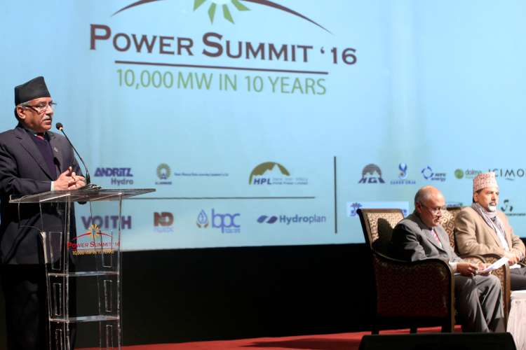 \"\"काठमाडौँ, ३० मङ्सिर । प्रधानमन्त्री पुष्पकमल दाहाल ‘‘प्रचण्ड’ ले आर्थिक समृद्धिको प्रमुख आधारको रुपमा रहेको जलविद्युत् क्षेत्रको विकासमा सरकारले केही महत्वाकांक्षी कार्ययोजना अगाडि सारेको बताएका छन् । सङ्घीय लोकतान्त्रिक गणतन्त्र नेपालको घोषणा भएलगत्तै गठन भएको आफ्नो नेतृत्वको सरकारले नै दश वर्षमा दश हजार मेगावाट जलविद्युत् उत्पादन गर्ने घोषणा गरेको स्मरण गराउँदै प्रधानमन्त्री दाहालले यस क्षेत्रमा रहेका नीतिगत, कानुनी तथा प्राविधिक समस्या समाधान गर्न सरकार लागिपरेको बताए । ऊर्जा मन्त्रालयको संयोजनमा स्वतन्त्र ऊर्जा उत्पादकको संस्था ९इपान०ले आयोजना गरेको पावर समिट–२०१६ को बिहीबार उद्घाटन गर्दै प्रधानमन्त्री दाहालले भने – “मुलुकमा जारी ऊर्जा सङ्कटलाई समाधान गर्ने लक्ष्यका साथ सरकारले ऊर्जा क्षेत्रमा दशवर्षे सङ्कटकालीन कार्ययोजना अगाडि सारेको छ र सो अवधिमा दश हजार मेगावाट विद्युत् उत्पादन गर्ने लक्ष्य राखेको छ ।” सरकारले ऊर्जा क्षेत्रमा लगानी गर्न चाहने निजी क्षेत्रलाई सहजीकरण गर्दै आएको उल्लेख गर्दै उनले उत्पादन, प्रसारण लाइन निर्माणमा निजी क्षेत्रसँग मिलेर अगाडि बढ्न चाहेको र त्यसका लागि सहज वातावरण समेत बनेको स्पष्ट पारे । सरकारले बहुउद्देश्यीय आयोजनालाई प्राथमिकताका साथ अगाडि बढाउन चाहेको स्पष्ट पार्दै उनले भने – यस्ता आयोजनाबाट रोजगारीको सिर्जना, प्रविधिको हस्तान्तरण तथा लगानीका लागि समेत सहज वातावरण तयार पार्ने मेरो विश्वास छ ।” केही महत्वपूर्ण र ठूला आयोजना ऊर्जा सुरक्षाका लागि समेत महत्वपूर्ण रहेको प्रधानमन्त्रीको भनाइ थियो । राष्ट्रिय गौरवका आयोजना तोकिएको समय भन्दा पहिले सम्पन्न गरे पुरस्कारको व्यवस्था गर्ने सम्बन्धमा सरकारले यसअघि नै घोषणा गरिसकेको जानकारी दिँदै प्रधानमन्त्री दाहालले माथिल्लो तामाकोसी, चमेलिया जस्ता महत्वपूर्ण आयोजनाको आफूले स्थलगत अवलोकन गरेर चाँडो भन्दा चाँडो काम सम्पन्न गर्न निर्देशन दिएको उल्लेख गरे । नेपाल र भारतबीच सम्पन्न भएको विद्युत् व्यापार सम्झौताले नेपालको जलविद्युत् क्षेत्रमा लगानीका लागि मार्गप्रशस्त गरेको भन्दै प्रधानमन्त्रीले सो सम्झौता कार्यान्वयन गर्दै त्यसमा केही समस्या आए कूटनीतिक पहल मार्फत समाधान गरिने स्पष्ट पारे । सरकारले राजधानीलाई विद्युत् कटौतीबाट मुक्त पारेको र मुलुकभर नै सहज रुपमा ऊर्जा उपलब्ध गराउन हरसंभव उपाय अवलम्बन गर्ने प्रतिवद्धता पनि उनले व्यक्त गरे । सरकार केही ठूला आयोजनाको निर्माण सुरु गर्ने तयारीमा रहेको जानकारी दिँदै प्रधानमन्त्री दाहालले निजी क्षेत्रले समेत ढुक्क भएर लगानी गर्ने अवस्थाको सिर्जना भएको स्पष्ट पारे