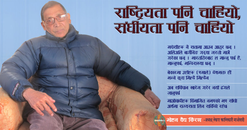 \"\"नेकपा (क्रान्तिकारी माओवादी)का अध्यक्ष मोहन वैद्य ‘किरण’ ले विभिन्न असतुष्ट पक्षको माग सम्बोधन गर्न भनी सरकारले अहिले ल्याएको संशोधनबाट पनि मुलुकको समस्या समाधान नहुने बताएका छन् । पछिल्लो मुलुकको राजनीतिक अवस्थाबारे कुरा गर्न खबरडबली टोली वैद्य निवासमा पुग्दा उनले संविधान संशोधनदेखि पार्टी फुटबारे खुलेर कुरा गरे । माओवादी विभाजन नभएको भए अहिले सत्ता नै कब्जा गर्न सकिने अवस्था रहेको भन्दै उनी चुक्चुकाए । उनले अहिले राष्ट्रियतामाथि अतिक्रमण भइरहेको भन्दै राष्ट्रियताका लागि राष्ट्रिय एकताको पनि आवश्यकता औंल्याए । मधेसवादी दललाई वर्तमान सरकाकै सगोत्री भन्दै वैद्यले उनीहरुलाई समेत मिलाएर लैजान नसक्नु अहिलेका प्रमुख तीन दलको कमजोरी औंल्याए । संघीयताको मापदण्डअनुसार नगइ पुरानै संरचनामा निर्वाचन गर्ने विषयलाई उनले संसदीय ब्यवस्थाकै असफलता बताएका छन् । संविधान संशोधनका लागि अहिले ल्याइएको प्रस्ताव पनि त्रुटिपूर्ण रहेको औंल्याए । प्रस्तुत छ, समसामयिक राजनीतिक विषयमा क्रान्तिकारी माओवादीका अध्यक्ष वैद्यसँग गरिएको संक्षिप्त कुराकानी : सरकार संविधान संशोधन गरेर समस्या समाधान हुन्छ भनेर लागिरहेको छ, अर्काथरी संशोधन होइन, पुरानै संशोधन ठीक छ भन्दै आन्दोलित छन् । तपाईँहरु पनि संशोधन ठीक छैन भन्नेहरुलाई साथ दिँदै हुनुहुन्छ, यसको अर्थ के हो ? अहिले संशोधनको विरोध गर्नेहरु दुई पक्ष छन् जस्तो लाग्छ । एउटा अहिलेकै संघीय लोकतान्त्रिक गणतन्त्र र अहिलेको संविधानलाई मुलभूत रुपमा स्वीकार गर्ने अनि संशोधनको मात्रै विरोध गर्ने गरी एमाले आएको छ । हामी यो संविधान संशोधन गरेर हुँदैन, यसलाई खारेज गरेर नयाँ बनाउनुपर्छ भन्नेमा छौं । यसमा निकै फरक छ । हामीले त्यो धारासँग मिलेर आन्दोलन गरेका पनि होइनौं । मिलेर आन्दोलन गरेको भन्ने एउटा संयोग मात्रै परेको हो । अहिले बुटवल लगायतका ठाउँमा आन्दोलन भइरहेको छ । तर हामीले यो आन्दोलनको जायज माग मात्रै सम्बोधन गर्छौं भनेका छौं । बन्द गर्नेहरुले एकातिर पहाड र मधेसलाई टुक्र्याउनु हुँदैन भनिरहेका छन् । अर्कोतिर मगराँत चाहिन्छ भनेर पनि आन्दोलन गरिरहेका छन् । हामी चाँही मगराँत चाहिन्छ भन्ने कुरा ठीक हो भन्नेका छौं । मगराँतको कुरा राखेर भएको आन्दोलनमा हाम्रो पूर्ण समर्थन रहन्छ । अब त्यही प्रदेश (५ नम्बर प्रदेश) अन्तर्गत थारुवान पनि पर्यो । थारुहरु कैलाली र कञ्चनपुर पनि थारुवानमा हुनुपर्छ भन्नेमा छन् । हामीले थारुहरुको माग पनि जायज मानेका छौं । त्यसैले हामीले जायज मागमा मात्रै समर्थन गर्ने भनेका छौं । अरु त्यो आन्दोलनमा हामी कस्सिएर लाग्ने भन्ने छैन । त्यसो भए, अहिले सरकारले अघि सारेको ५ नम्बर प्रदेशबाट पहा