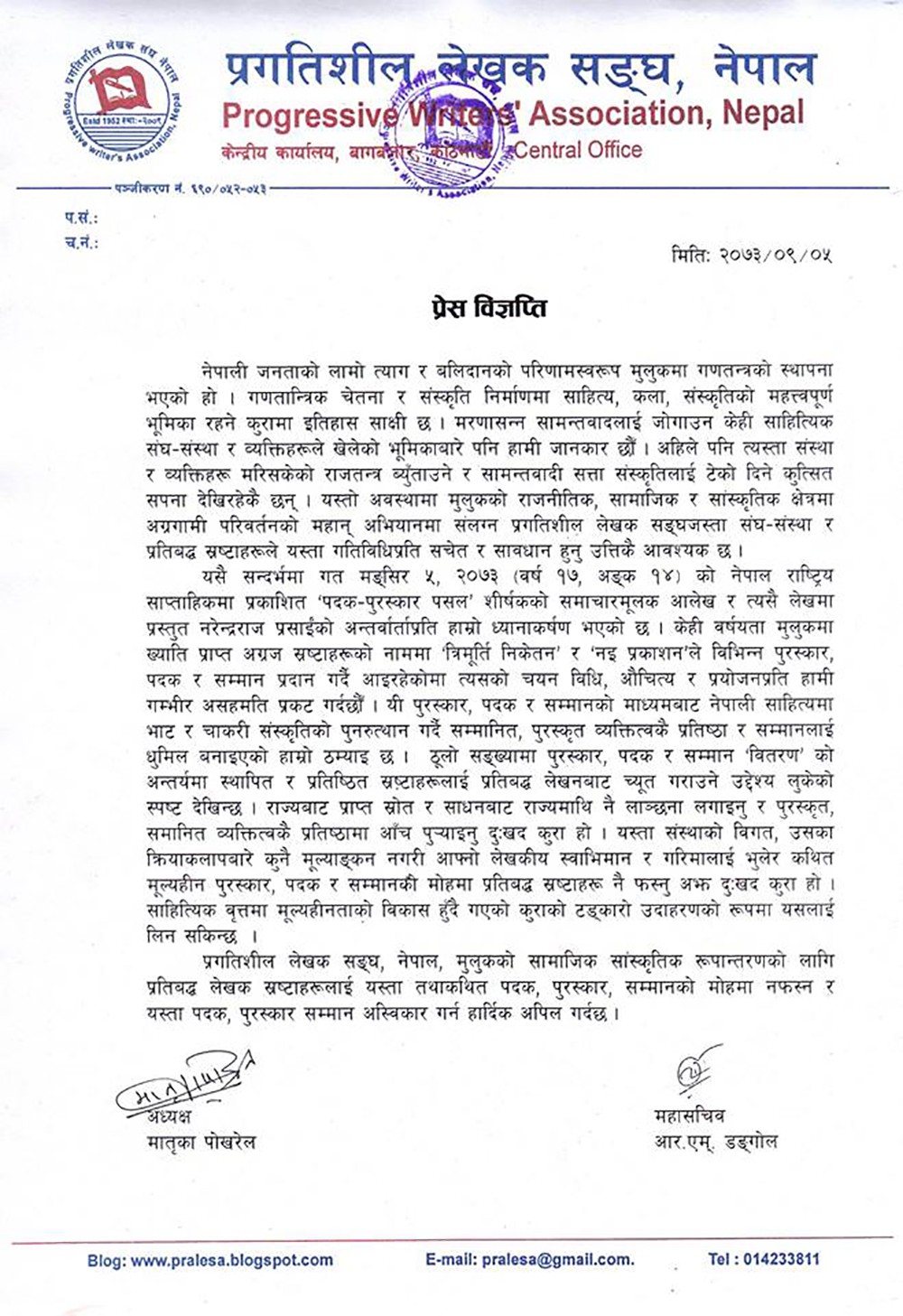 \"\"काठमाडौं, ६ पुस । प्रगतिशील लेखक संघले साहित्यकारहरु पदक, पुरस्कार र सम्मानको मोहमा नफस्न अपिल गरेको छ । मंसिर ५ गते नेपाल राष्ट्रिय साप्ताहिकमा प्रकाशित साहित्यकार नरेन्द्रराज प्रसाईको अन्र्तवार्ताप्रति आपत्ति जनाउँदै संघले जारी गरेको विज्ञप्तिमार्फत सर्जकहरुलाई यस्तो आग्रह गरेको हो । विज्ञप्तिमार्फत संघले अग्रज स्रष्टाहरूको नाममा ‘त्रिमूर्ति निकेतन’ र ‘नइ प्रकाशन’ले प्रदान गर्दै आएको पुरस्कार, पदक र सम्मानको चयन विधि, औचित्य र प्रयोजनप्रति गम्भीर असहमति जनाएको छ । संघका अध्यक्ष मात्रिका पोखरेल र महासचिव आर एम डङ्गोलद्वारा हस्ताक्षरित विज्ञप्तिमा भनिएको छ, ‘पुरस्कार, पदक र सम्मानको माध्यमबाट नेपाली साहित्यमा भाट र चाकरी संस्कृतिको पुनरुत्थान गर्दै सम्मानित, पुरस्कृत व्यक्तित्वकै प्रतिष्ठा र सम्मानलाई धुमिल बनाइएको हाम्रो ठम्याइ छ ।’ संघले ठूलो सङ्ख्यामा पुरस्कार, पदक र सम्मान ‘वितरण’ को अन्तर्यमा स्थापित र प्रतिष्ठित स्रष्टाहरूलाई प्रतिबद्ध लेखनबाट च्यूत गराउने उद्देश्य लुकेको बताएको छ । राज्यबाट प्राप्त स्रोत र साधनबाट राज्यमाथि नै लाञ्छना लगाइनु र पुरस्कृत, सम्मानित व्यक्तिकै प्रतिष्ठामा आँच पुरयाइनु दुःखद कुरा रहेको संघको ठम्याइरहेको छ । सो अन्र्तवार्तामा प्रसाईंले कतिपय मर्नुअघि पुरस्कार पाए हुन्थ्यो भन्दै उनी भएको ठाउँमा जाने गरेको बताएका थिए। उनले अन्र्तवार्तामा भएका थिए, ‘कतिपय ‘मर्नुअघि पुरस्कार पाए हुन्थ्यो’ भनेर आउँछन्। कतिपय ‘पैसा तँ खा, पुरस्कार मलाई दे’ भन्छन्। कतिपय ‘पैसा मै हाल्छु, सम्मान दे’ पनि भन्छन् ।’