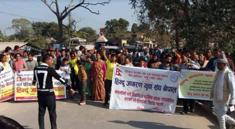 \"\"धनगढी, १० पुस । इसाई धर्मावलम्बीहरुले ‘क्रिसमस डे’ मनाइरहँदा हिन्दुवादीहरुले आइतबार सुदूरपश्चिम ठप्प पारेका छन् । कैलालीको गोदावरी गाविसस्थित भ्यागुतेमा गाई मारिएको विरोधमा हिन्दुवादीहरुले आइतबार सुदूरपश्चिम बन्द गराएका हुन् । बन्दका कारण सुदूरपश्चिमको जनजीवन विहानैदेखि प्रभावित भएको छ । बन्दको सबैभन्दा बढी प्रभाव कैलालीमा परेको छ । हिन्दूवादी सङ्घसङ्गठनले धनगढी लगायत विभिन्न ठाउँमा विहानैदेखि प्रदर्शन जारी राखेका छन् । उनीहरुले गौ हत्याको छानबिन गर, चर्च निर्माण रोक लगाउँ, नेपाललाई हिन्दू राष्ट्र कायम गर लगायतका नारा लगाउदैँ प्रदर्शन गरिरहेका छन् । राप्रपा, हिन्दु जागरण युवासंघ नेपाल कञ्चनपुर, हिन्दु जागरण युवासंघ नेपाल कैलाली, राष्ट्रिय मठ मन्दिर समन्वय महासमिति, लक्ष्मीनारायण मन्दिर कैलाली, हिन्दुराष्ट्र संरक्षण संघर्ष समिति कैलाली, गौ–संरक्षण समिति लगायतले बन्द आयोजना गरेका हुन् । बन्दका कारण यस क्षेत्रमा यातायात, व्यापार, व्यवसाय सबै ठप्प भएको छ । धनगढी–डडेलधुरा सडक अन्तर्गत चुरे पहाडमा पर्ने भ्यागुते सडकखण्ड आसपासमा पाँच दिनअघि मरेका गाईगोरु फेला परेका थिए । कञ्चनपुरको वेदकोट नगरपालिका क्षेत्रमा रहेका छाडा गाईगोरुलाई राति ट्रकमा राखेर भ्यागुते सडकखण्डमा पु¥याएर छाडिएको बताइएको छ । ती गाईहरु मारेर फालिएको भन्दै हिन्दुवादीहरु आन्दोलित भएका हुन् । घटनाका सम्बन्धमा चौपाया ढुवानी गरी भ्यागुतेसम्म पु¥याउने ट्रकका चालकसँग सोधपुछ गर्ने काम भइरहेको जिल्ला प्रहरी कार्यालय कैलालीले जनाएको छ । दुर्गन्ध नफैलियोस् भनेर मरेका चौपायालाई खाल्डो खनेर पुरिएको छ ।