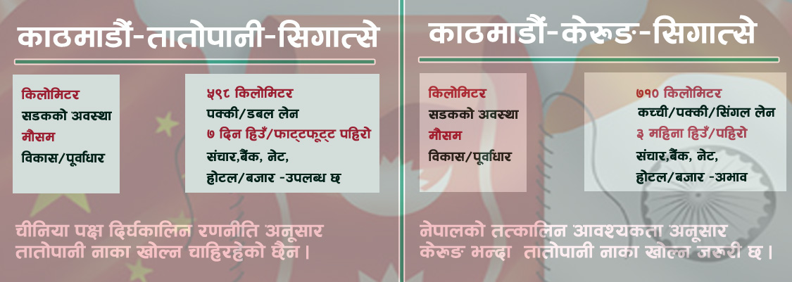 \"\"काठमाडौं, १२ पुस । झण्डै दुईवर्षदेखि बन्द चीनसँगको सबैभन्दा ठुलो कारोवार हुने नाका बन्द अवस्थामा रहेको भएपनि चीनले दिर्घकालिक रुपमै नखोल्ने रणनीति बनाएपश्चात बन्दको बन्दै छ । भूकम्पले पुर्याएको क्षतिपश्चात झण्डै साविकको अवस्थामा बनाइएको नेपालतिरको कोदारी राजमार्ग खुल्ला हुँदा समेत चीनले तातोपानि नाका खोल्न आलटाल गरिरहेको थियो । तातोपानिको सट्टामा केरुङ नाकालाई सहज बनाउने जनाएको चीनले भारतीय नाकाबन्दीमा समेत तातोपानि नाका खोल्न चाहेन । नेपाललाई असल छिमेकका रुपमा परिभाषित गर्दै आएको चीनको भारतीय नाकाबन्दीताकाको व्यवहार पनि रहस्यत्मक नै थियो । र अहिले पनि उही प्रवृति जारी छ । गत वर्षाको बाडीको कारण क्षतविक्षेत कोदारी राजमार्ग पूनर्निमाणको काम लगभग अन्तिम अवस्थामा पुगेको छ भने केही स्थानहरुमा कच्ची मार्ग सहित चीनसँग जोडिएको समेत छ । खबरडबली सहकर्मी तातोपानि नाकाको अवस्था बुझ्न पुग्दा आफ्नै नीजि सवारीमा चीनसँगको सिमानकासम्म पुगेर फर्किएका छन् भने मालबाहक सवारी चल्न कुनै समस्य नभएको भेट्टाएका छन् । हाल चीनसँग सडक संजालबाट जोडिएका सिन्धुपाल्चोकको तातोपानी र रसुवाको केरुङ नाका दुईवटामात्रै भरपर्दा विकल्प हुन् । तातोपानी नाकामा चीनियाँ पक्षले व्यापारिक कारोवार गर्न खुल्ला गरेको छैन भने केरुङ नाकामा बारम्बार चीनियाँ भुगोलमा आउने बाटोको अवरोधका कारण पूर्ण संचालनको अवस्थामा छैन । नेपालको तात्कालिन आवश्यकतालाई ध्यानमा राख्ने हो भने केरुङभन्दा तातोपानी नाका नै बढी सहज हुन्छ तर चीनिया पक्ष तातोपानी भन्दा केरुङलाई नै दिर्घकालिन रुपमा जोड गरिरहेको छ । चीनिया पक्षको दिर्घकालिन रुपमा जे जोड भएपनि नेपाली अधिकारीहरुले अहिलेलाई तातोपानी नाका खुलाउन पहल गर्नुपर्नेमा त्यो पहल भईरहेको छैन । रणनीतिक हिसाबले चीनको लक्ष्य सिल्क रोडको अवधारणा अनुसार केरुङ नाका नै हो र उनिहरुको चासो तिब्बतको सूरक्षा जोखिमसँग समेत सम्बन्धित छ । किन तातोपानी नाका ? अहिले केरुङ नाका खुल्ने र बन्द हुने क्रममा छ । काठमाडौंदेखि केरुङसम्मको १७४ किमि बाटो करिब सबै ठाउँमा सिंगल लेन छ भने नेपालतिर वर्षामा पहिरोको जोखिम उच्च छ । उता चीनको भुगोलमा अब करिब ३ महिना हिउँ परेर बाटो अवरुद्ध हुन्छ । त्यो क्रममा प्राय त व्यापारिक कारोवार गर्न असम्भव हुन्छ । अर्कोतिर काठमाडौंदेखि चीनको सिगात्सेसम्मको दुरी तातोपानी नाकाको तुलनामा ११२ किलोमिटर बढी पर्छ । अर्थाता काठमाडौं–केरुङ–सिगात्से सम्मको दुरी ७१० किलोमिटर हो भने काठमाडौं–तातोपानी–सिगात्सेको दुरी ११२ किलोमिटर कम अर्थात ५९८ किलोमिटर मात्रै हो । भौतिक पुर्वाधारका हिसाबले बर्षौदेखि संचालनमा रहेको तातोपानी 
