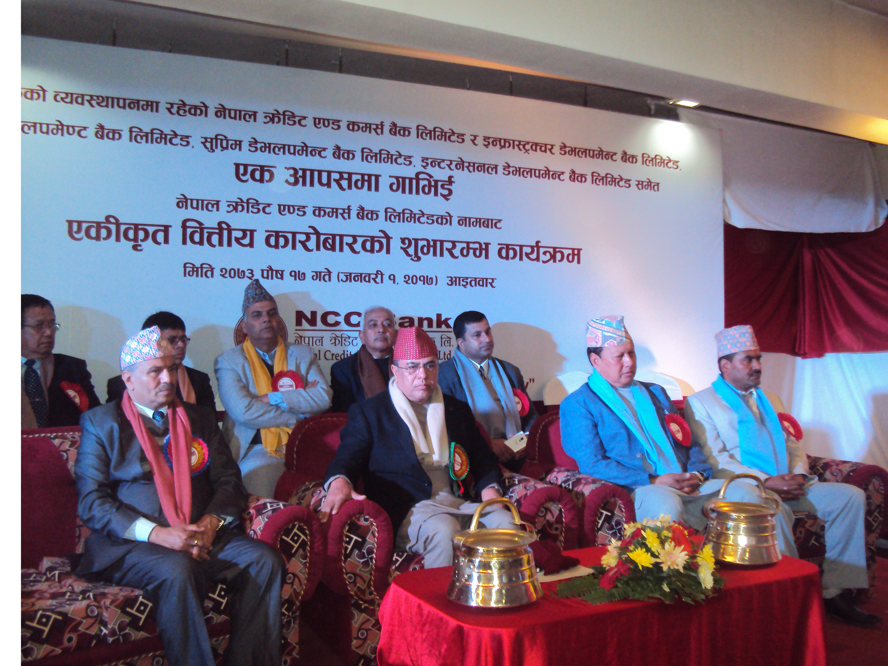 \"\"काठमाडौँ, १७ पुस । पाँच बैंक आज गाभिएका छन् । नेपाल क्रेडिट एन्ड कमर्स बैंक, इन्फ्रास्ट्रक्चर डेभलपमेन्ट बैंक, एपेक्स डेभलपमेन्ट बैंक, सुप्रिम डेभलपमेन्ट बैंक र इन्टरनेशनल डेभलपमेन्ट बैंक आज गाभिएका हुन् । एकीकरणपछि नेपाल क्रेडिट एण्ड कमर्स बैंकका नामबाट आजदेखि कारोबार सुरु गरिएको छ । एकीकरण सो बैंकको चुक्ता पूँजी चार अर्ब भन्दा माथि पुगेको छ । नेपाल राष्ट्र बैंकका गभर्नर डा चिरञ्जीवी नेपालले एकीकृत कारोबारको शुभारम्भ गर्दै बैंकका कर्मचारी तथा व्यवस्थापनलाई वित्तीय अनुशासन कायम गर्न र जनताको निक्षेपलाई सुरक्षित तरिकाले लगानी गर्न निर्देशन दिए । उनले देशका सहरी क्षेत्रमा बैंक तथा वित्तीय संस्था धेरै खुले पनि पुँजीको वृद्धि हुन नसकेको र सुपरीवेक्षण गर्न पनि कठिनाइ भएको बताए । गभर्नर नेपालले विभिन्न बैंक तथा वित्तीय क्षेत्रले धितोको अधिक मूल्याङ्कन गरी खराव कर्जा प्रवाह गरेका कारण विगतमा १६ वटा बैंक तथा वित्तीय संस्थालाई समस्याग्रस्त घोषणा गरिएको जानकारी दिँदै अहिले राष्ट्र बैंकले सबै बैङ्क तथा वित्तीय संस्थाको शूक्ष्म निगरानी गरिरहेको बताए । बैंकका प्रमुख कार्यकारी अधिकृत रमेशराज अर्यालले अझै पनि ६० प्रतिशत जनसङ्ख्या वित्तीय सञ्जालमा जोडिन बाँकी रहेको बताए ।