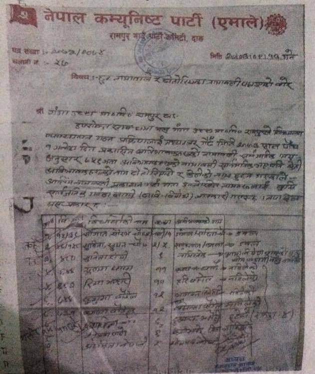 \"\"काठमाडौं, २४ पुस । दाङ रामपुरस्थित गंगा उच्च माविले विद्यालय व्यवस्थापन समिति गठन प्रक्रियालाई लक्षित गर्दै १ पुसमा सात सय ५९ अभिभावकको नामावली प्रकाशन ग¥यो । उक्त संख्याप्रति असन्तुष्टि जनाउँदै पुस ११ गते विद्यालयमा एउटा पत्र पुग्यो । आजको नागरिक दैनिकमा खबर छ– प्रकाशित अभिभावक सूची अधुरो रहेको भन्दै लेखिएको उक्त पत्र एमाले रामपुर गाउँ कमिटीले पठाएको थियो । पार्टीकै ‘लेटर प्याड’ मा लेखिएको उक्त पत्रमा प्रकाशित नामावलीमा केही नाम दोहोरिएको र केही नाम छुटेको भन्दै थप नौ जनाको नाम समावेश गर्न दबाब दिइएको थियो । नौ जनाको नाम लेखिएको उक्त पत्रमा भनिएको छ, ‘उल्लिखित नामहरुलाई बुझी सार्वजनिक गर्नका लागि दाबी विरोध जानकारी गराइन्छ ।’ पार्टीको दबाब अनुसार विद्यालयले नामावली हेरफेरसमेत गरेको स्रोतले बताएको छ ।