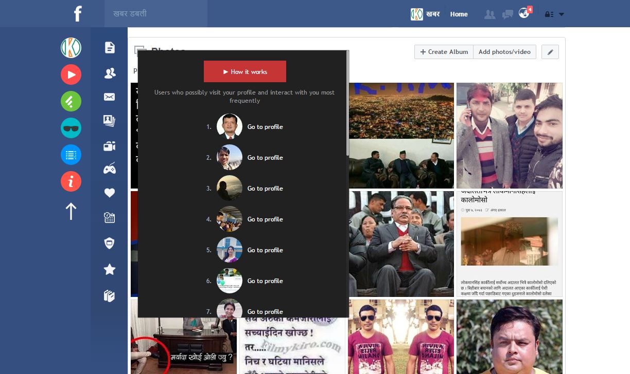 \"\"काठमाडौं,  माघ । तपाईलाई तपाईको फेसबुक प्रोफाइल कसले हेरिरहेको छ भनेर जानकारी चाहिएको छ भने अब गुगल क्रोमको बाउजरबाट संम्भव भएको बताइएको छ। अजवगजव नामक भारतीय अनलाईनको दावी अनुसार फेसबुक प्रोफाइल कसले हेरिरहेको छ भनेर थाहा पाउन सकिन्छ । खबरडबलीले सोही अनलाइनलाई आधार मान्दै गरेको कोशिषमा केही प्रोफाइल भिजिटरहरुको लिष्ट आयो । यो प्रमाणित हो कि होइन भन्ने कुनै आधारका लागी कि फेसबुकले मुख खोल्नुपर्छ कि धेरै युजरहरुले प्रयोग गरिसकेपछि विश्वस्त हुन सकिन्छ । हामी तपाईलाई यो तरिका भन्न गइरहेका छौं । तपाईले प्रयोग गर्दा तपाईको कम्प्युटरको इन्टरनेट ब्राउजर भने गुगल क्रोम नै हुनु अनिवार्य छ । स्टेप : १–गुगल क्रोम ओपन गरिसकेपश्चात दाहिने कुनामा एक स्क्रोल आउँछ । त्यो क्लिक गरेपछि setting सेटिङमा जानुहोस् । \"\" स्टेप : २ –फोटोको देब्रे भागमा देखिएको extention गएर Get More Extention जानुहोस् । \"\" स्टेप : ३– सर्च अप्सनमा गएर Flatebook सर्च गर्नुहोस् । \"\" स्टेप : ४– अब यसलाई क्रोममा Add गर्नुहोस् । यसको अप्सन ब्राउजरको दाहिने कुनामा देखिन्छ । \"\" स्टेप : ५ – अब यो गुगल क्रोम ब्राउजरमा एड भयो । \"\" स्टेप : ६ –अब फेसबुक रिफ्रेस गर्नुहोस् या लगआउट गरेर फेरी खोल्नुहोस् । अब तपाइको फेसबुकमा नयाँ थिम देखा पर्छ । \"\" स्टेप : ७ – अब तपाई देब्रेपट्टी चश्मा आकारको प्रोफाइल भिजिटर टुल्स देख्नुहुनेछ । क्लिक गरेर आफ्नो प्रोफाइल कसले हेर्यो थाहा पाउन सक्नुहुनेछ । \"\"\"\" नोट : तपाईले यो अप्सनमा जाँदा फेसबुकको थिम अप्ठ्यारो लाग्यो भने भने ब्राउजरको देब्रेसाइटमा एउटा रातो बटम छ त्यो बटम   क्लिक  गरेपछि  पुरानै थिम देख्नसक्नुहुनेछ । फेरी प्रयोग गर्न मन लागे बटमलाई क्लिक  गर्नुहोस् ।