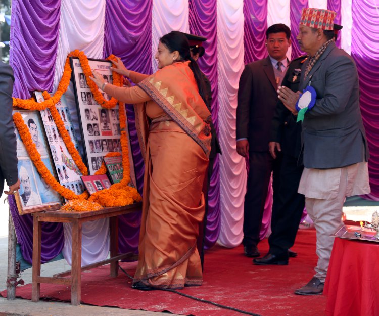 \"\"काठमाडौँ, १६ माघ । राष्ट्रपति विद्यादेवी भण्डारीले अव कसैले सहिद हुनुनपर्ने गरी लोकतन्त्रको संस्थागत विकास गरिनुपर्ने बताएकी छन् । सहिद दिवसका अवसरमा शान्ति तथा पुनःनिर्माण मन्त्रालय र राष्ट्रिय सहिद तथा शान्तिस्मारकले आज गोकर्णमा आयोजना गरेको राष्ट्रिय सहिद एवम् वर–पिपल वृक्षरोपण कार्यक्रमलाई सम्बोधन गर्दै उनले भनिन् – “सही लोकतान्त्रिक अभ्यासले नै लोकतन्त्रको जरो बलियो हुन्छ ।” राष्ट्रपति भण्डारीले “अब कसैले सहिद बन्नु नपर्ने वातावरण सिर्जना गरेमा मात्र सहिदप्रति सच्चा श्रद्धाञ्जलि हुन्छ” भन्दै “लोकतान्त्रिक अभ्यासले नै समस्या समाधानमा सहयोग गर्नेछ, सहमति र सहकार्यका साथ अघि बढ्न सबै दललाई सहिद दिवसले प्रेरणा देओस् ।” सरकारले विसं २०७१ देखि २०८० सम्मलाई वन दशक घोषणा गरेकाले यसले जलवायु परिवर्तन र तापमानलाई सन्तुलनमा ल्याउने विश्वास व्यक्त गर्दै उनले भनिन् –“पूर्खाले वर र पिपलको बिरुवा रोप्ने प्रचलन वातावरण सन्तुलन कायम राख्न चलाएको कद्मप्रति सबैको ध्यान जानुपर्दछ ।” शान्ति तथा पुनःनिर्माण मन्त्री सीतादेवी यादवले सहिदस्मारक निर्माण सम्पन्न भएपछि सहिदप्रति थोरै भए पनि न्याय हुने विश्वास व्यक्त गरिन् । “विगतमा राहत नपाएका द्वन्द्वपीडितलाई राहत वितरणका लागि कार्यदल गठन भएको छ, अव पीडित सबैले राहत पाउनेछन्, सहिद स्मारक बनेपछि शान्ति स्थापनाका ठोस् आधार तयार हुनेछ, द्वन्द्वपछिको पुनःनिर्माणलाई पनि मन्त्रालयले तीव्रता दिनेछ”–उनले भनिन् मन्त्री यादवले सरकारको निर्णयअनुसार निर्माण भइरहेको स्मारक सम्पन्न गर्न विसं २०७२ वैशाखको भूकम्प र सोही वर्षको असोज पछिको अघोषित नाकाबन्दीले केही ढिलाइ भए पनि अव छिटो सम्पन्न हुने विश्वास व्यक्त गरिन । कार्यक्रममा सांसद रामेश्वर फुयाँल, अम्बिका बस्नेत र पेम्बा लामा, मन्त्रालयका सचिव सुमनप्रसाद शर्मा, स्मारक निर्माण समितिका अध्यक्ष सुदर्शन सिग्देलले शान्ति, लोकतन्त्र र राष्ट्रिय एकताका लागि निर्माण भइरहेको स्मारक सम्पन्न गराउन सबैको सहयोग हुनुपर्नेमा जोड दिए । गुरुयोजना बनाएर विसं २०६८ देखि निर्माण सुरु भएको स्मारकको ७१ प्रतिशत काम सम्पन्न भएकाले बाँकी २९ प्रतिशत काम पनि विसं २०७४ चैत मसान्तसम्ममा सक्ने लक्ष्यका साथ काम भइरहेको महासचिव त्रिलोचन पौडेलले जानकारी दिए। मन्त्रिपरिषद्ले विसं २०६४ जेठ ११ गते गोकर्णको यज्ञडोल (जगडोल) सामुदायिक वनको ६५० रोपनी क्षेत्रफलमा सहिदका नाममा स्मारक निर्माण गर्ने निर्णय गरेको थियो । स्मारक अन्तर्गत बन्नेगरी पाँचवटा सहायक पार्क निर्माणको गुरुयोजना पनि मन्त्रालयले स्वीकृत गरिसकेको छ । रासस