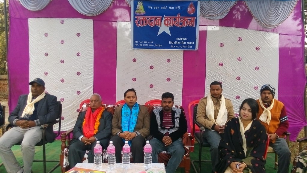\"\" -रबिन्द्र प्रताप गुप्ता भैरहवा, १६ माघ । सहिद दिवसको अवसरमा पिपरहिया सेवा समाज सि.न.पा–६, रुपन्देहीको आयोजनामा आइतबार रक्तदान कार्यक्रम सम्पन्न भएको छ । रगतको अभावमा कसैले पनि ज्यान गुमाउन नपरोस भन्ने उद्धेश्यले प्रत्येक वर्ष संस्थाले रक्तदान कार्यक्रम आयोजना गर्दै आएको समाजका अध्यक्ष मुस्ताक अहमद भाटले बताए । भैरहवा स्थित नेवा खलमा भएको रक्तदानमा २६ युनिट रगत संकलन भएको भाटले जानकारी दिए । समाजका अध्यक्ष मुस्ताक अहमद भाटको अध्यक्षता, जनरल फिजिसियन डा.रामजी चौधरीको प्रमुख आतिथ्यता, डा.अभिषेक कर्णको विशिष्ट आतिथ्यता, महात्मा बुद्ध माविका प्रधानाध्यापक कन्हई प्रसाद यादव, समाजसेवी विरेन्द्र नाथ श्रीवास्तव, रामवचन गुप्ता, गोविन्द उपाध्याय, राजेश चौधरी लगायतको आतिथ्यतामा कार्यक्रम सम्पन्न भएको थियो । समाजका सचिव एवं कार्यक्रम संयोजक विजय कर्णको सञ्चालनमा सम्पन्न कार्यक्रममा संस्थाका सह–सचिव रबिन्द्र प्रताप गुप्ताले रक्तदान कार्यक्रमको उद्धेश्य माथि प्रकाश पारेका थिए । कार्यक्रममा स्थानीय युवा, नेपाली सेना २ नम्बर ग्यारिजन गणका जवानहरुले रक्तदान गरेका थिए ।
