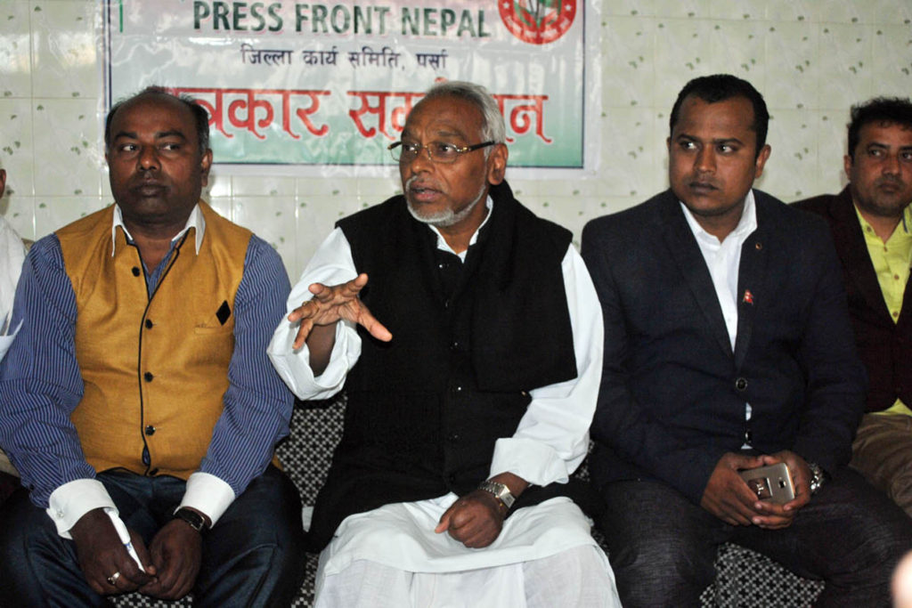 \"\" पर्सा, १ फागुन । नेपाल सद्भावना पार्टीका राष्ट्रिय अध्यक्ष राजेन्द्र महतोले संविधानलाई असफल गरी प्राप्त गरेका सबै उपलब्धिलाई समाप्त पार्ने षड्यन्त्रमा एमाले लागेकोे आरोप लगाएका छन् । प्रेस मञ्चले वीरगन्जमा अयोजना गरेको पत्रकार सम्मेलनमा अध्यक्ष महतोले संविधान संशोधनको विरोध गरी संविधान कार्यान्वयनमा बाधा सिर्जना गर्दै मुलुकलाई अन्योलतातर्फ धकेल्न एमालेका नेता लागिपरेका उनको भनाइ थियो । संसद्मा दर्ता रहेको संशोधन प्रस्ताव पारित नभएसम्म निर्वाचन नहुने र तोकिएको समयमा तीनवटै तहको निर्वाचन नभए संविधान असफल हुने महतोले बताए । “परिमार्जनसहित संविधान संशोधन नभए मुलुकमा कुनै पनि निर्वाचन सम्भव छैन,” उनले भने । अध्यक्ष महतोले तीन दिनसम्म वीरगन्जमा बसेको सद्भावना पार्टीको विस्तारित बैठकले गरेका निर्णयलाई सार्वजनिक गरे । पार्टीको मधेस आन्दोलनको मुद्दालाई संविधान संशोधनमार्फत सम्बोधन नगरेसम्म निर्वाचनमा सहभागी नहुने, निर्वाचन हुन नदिने तथा सद्भावना पार्टीको छैटौँ महाधिवेशन २०७४ साल जेठ १, २ र ३ गते वीरगन्जमा गर्ने, मधेस आन्दोलनका क्रममा ज्यान गुमाएकामध्ये सहिद घोषणा गर्न बाँकीलाई सहिद घोषणाका लागि सरकारलाई दबाब दिनेलगायत निर्णय गरेको उनले जानकारी दिए ।