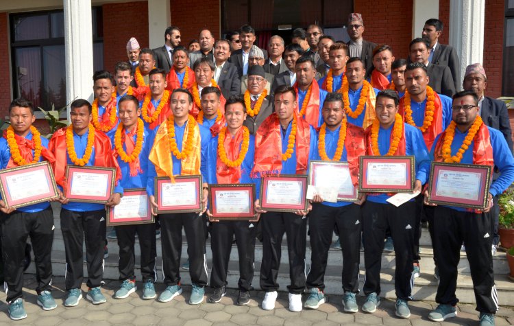 \"\"काठमाडौं, ३ फागुन । प्रधानमन्त्री पुष्पकमल दाहाल ‘प्रचण्ड’ले सन् २०१६, नोभेम्वर २ देखि १५ सम्म मलेसियामा भएको एएफसी सोलिडारिटी कप फुटबल प्रतियोगिताका बिजेता खेलाडीहरुलाई प्रोत्साहनस्वरुप घोषणा गरिएको नगद पुरस्कार सोमबार एक कार्यक्रमकाबीच हस्तान्तरण गरेका छन् । सोमबार दिउँसो प्रधानमन्त्री निवास बालुवाटारको सभाहलमा एक कार्यक्रमको आयोजना गरी प्रधानमन्त्रीले नगद पुरस्कारको रकम हस्तान्तरण गरेका हुन् । प्रधानमन्त्रीले २३ जना बिजेता खेलाडी र प्रमूख प्रशिक्षकलाई जनही ३ लाख, सहायक प्रशिक्षकलाई २ लाख र सामान्य ज्ञान प्रशिक्षक र फिजियोथेरापिष्टलाई जनही ५० हजार नगद पुरस्कारले सम्मान गरेका हुन् । ३ लाख नगदद्वारा पुरस्कृत हुने खेलाडीहरुमा क्याप्टेन अनिल गुरुङ, भाइस क्याप्टेन बिराज महर्जन, खेलाडीहरु बिकेश कुथु, रबिन श्रेष्ठ, अनन्त तामाङ, दीपक गुरुङ, आदित्य चौधरी, बिमल घर्तिमगर, बिशाल राई, रञ्जन बिष्ट, हेमन गुरुङ, बिक्रम लामा, कमल श्रेष्ठ, अञ्जान बिष्ट, सुजल श्रेष्ठ, किरणकुमार लिम्बु, सुमन लामा, नवयुग श्रेष्ठ, देवेन्द्र तामाङ, बिशाल श्रेष्ठ, भरत खवास, राजेन्द्र रावल, रञ्जित धिमाल र मूख्य प्रशिक्षक ग्वोतुकु कोजी रहेका थिए । त्यसैगरी सहायक प्रशिक्षक राजुकाजी शाक्यलाई रु २ लाख, सामान्य ज्ञान प्रशिक्षक उज्जवल मानन्धर र फिजियोथेरापिष्ट सुरज भुसाललाई रु ५० हजार नगदद्वारा सम्मान गरिएको छ । खेलाडीहरुलाई सम्मान गर्दै प्रधानमन्त्री पुष्पकमल दाहाल ‘प्रचण्ड’ले खेलकूदले देशलाई भावनात्मक रुपमा एकतावद्ध बनाउने प्रधानमन्त्रीले बताए । ‘तपाईहरुले हासिल गरेको विजयले देशको गौरव बढाएको छ । देशलाई भावनात्मक रुपमा एकतावद्ध गरेको छ । कहिलेकाहीँ राजनीतिमा आउने विवाद र उतारचढावलाई सहमति र एकतामा बदल्न पनि तपाईहरुको विजय र एकताले प्रेरणा मिल्ने गरेको छ । हामी संविधान कार्यान्वयन र आर्थिक समृद्धि हासिल गर्ने अभियानमा छौं, यसमा तपाईहरुको विजय र भावी यात्राले थप प्रेरणा दिनेछ ।’ खेलाडीहरुलाई पुरस्कारको घोषणा गर्ने तर नदिने विगतको परम्परा अन्त्य हुनुपर्नेमा जोड दिँदै प्रधानमन्त्रीले भने, ‘तपाईहरुले सोलिडारिटी कप जितेलगत्तै सरकारले पुरस्कारको घोषणा गरेको थियो । विगतमा पुरस्कारको घोषणा गर्ने तर खेलाडीले नपाउने बिडम्वना पनि हामीकहाँ रहने गरेको थियो । यसपटक त्यस्तो नहोस् भन्नेमा म सुरुदेखि नै सचेत र चिन्तित पनि थिएँ । खेलाडीहरुको व्यस्तता र सरकारको पनि कामको चापका कारण सम्मानको काम केही ढिलो भयो, तैपनि तपाईहरुलाई सम्मान र पुरस्कृत गर्न पाउँदा म खुसी छु । अब पुरस्कार र सम्मानको घोषणा गर्ने तर खेलाडीहरुले नपाउने अवस्थाको अन्त्य हुनुपर्दछ ।’ कार्यक्रममा 