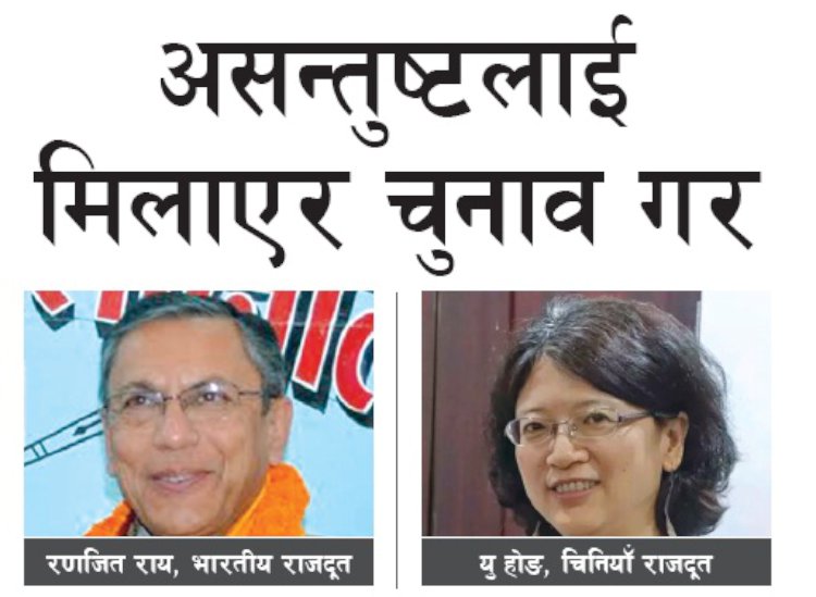 \"\"काठमाडौं, १४ फागुन । शुक्रबार फरक–फरक कार्यक्रम र फरक–फरक विषय । एउटा कार्यक्रमका वक्ता भारतीय राजदूत रणजित राय थिए भने अर्कोमा चिनियाँ राजदूत यु होङ । फरक समय र सन्दर्भका कार्यक्रममा दुवै राजदूतले नेपाल सरकारलाई एउटै कुरा सुझाए, ‘असन्तुष्ट दलसँग वार्ता गर ।’ आजको नयाँ पत्रिकामा खबर छ– नेपालका लागि चिनियाँ राजदूत होङले होटेल अन्नपूर्णमा नेपाल–चीन हिमालय मैत्री समाजको कार्यक्रममा ‘असहमति राखेका दलहरूलाई साथमा लिएर अघि बढ्न’ आग्रह गरिन् । ‘असहमति राखिरहेका दलहरूसँग वार्ता गरेर उनीहरूलाई पनि साथमा लिएर नेपालले सामाजिक समृद्धि हासिल गर्नेछ भन्नेमा चीन विश्वस्त छ,’ एमाले महासचिव ईश्वर पोखरेल, कांग्रेस नेता डा। रामशरण महतसहित हिमाली जिल्लाको प्रतिनिधित्व गर्ने सांसदहरूमाझ राजदूत होङले भनिन् । १० मिनेट लामो चिनियाँ भाषामा लेखेर ल्याएको सम्बोधनमा राजदूत होङले निर्वाचनबारे केही उल्लेख गरिनन् । त्यसअघि शुक्रबार दिउँसो रिपोर्टर्स क्लबमा भारतीय राजदूत रणजित रायले सबैलाई साथ लिएर निर्वाचनमा अघि जान सुझाब दिए । ‘संविधान जारी हुने वेलामा पनि हामीले सबैलाई मिलाएर जान भनेका थियौँ,’ दुई वर्षअघिको प्रसंग उल्लेख गर्दै रायले भने, ‘अहिले पनि हाम्रो कुरा त्यही छ कि सबैलाई साथमा लिएर दलहरू अघि जाऊन् । त्यसले लोकतन्त्र र स्थायित्व सुनिश्चित गर्छ । यसका लागि सरकारले गर्ने सबै प्रयासलाई भारत समर्थन र सहयोग गर्छ ।’ सैद्धान्तिक रूपमा भारतले निर्वाचनको विरोध नगर्ने उनको भनाइ थियो । ‘हाम्रो अडान एउटै छ,’ कार्यकाल सकेर १८ फागुनमा नयाँदिल्ली फर्किन लागेका रायले भने, ‘लोकतन्त्र सुदृढ पार्ने सबै प्रयासलाई संसारको सबैभन्दा ठूलो लोकतन्त्रका हिसाबले हामी समर्थन गर्छौँ, तर सबैलाई साथमा लिएर अघि बढ्दा नेपालमा स्थायित्व हुन्छ ।’ सरकारले स्थानीय तहको निर्वाचन घोषणा गरेपछि भारतका तर्फबाट आएको यो पहिलो प्रतिक्रिया हो । ‘निर्वाचन नियमित रूपमा हुनुपर्छ, त्यसले लोकतत्र सुदृढ गर्छ, यसमा कुनै द्विविधा छैन,’ रायले भने ।