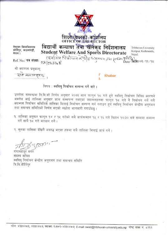 \"\"काठमाडौं, १५ फागुन । त्रिभुवन विशवविद्यालयले तोकिएको मितिमा स्ववियु चुनाव हुने भएको छ । विभिन्न विद्यार्थीहरुको विरोधकाबीच पनि १८ गते स्वतन्त्र विद्यार्थी युनियन (स्ववियु)को चुनाव गर्ने गरी अघि बढ्न सबै क्याम्पसहरुलाई परिपत्र गरेको छ । स्ववियु निर्वाचन केन्द्रीय अनुगमन समन्वय समिति त्रिवि किर्तिपुरले आइतबार एक विज्ञप्ति जारी गर्दै स्ववियु चुनाव तोकिएकै मितिमा सम्पन्न गर्न सवै क्याम्पसहरुलाई परिपत्र जारी गरेको हो । स्ववियु निर्वाचन केन्द्रीय अनुगमन समन्वय समिति त्रिवि किर्तिपुरका सदस्यसचिव गंगाबहादुर मगरद्धारा हस्ताक्षरित विज्ञप्तिमा फागुन १४ र १५ सवै कार्यक्रमहरु १५ र १६ गते विहान साढे दश बजेसम्म सम्पन्न गर्ने र फागुन १८ गते नै चुनाव गर्न निर्देशन दिएको छ । यसैबीच स्ववियु चुनावको पूर्वसन्ध्यामा अधिकांश क्याम्पसमा लगाएको ताला फोडेर उम्मेदवारी मनोनयन खुला गर्ने सहमति त्रिभुवन विश्वविद्यालय र विद्यार्थी संगठनहरुबीच भएको छ । उम्मेदवारी मनोनयनका दिन राजधानीका अधिकांश क्याम्पसमा नेपाल विद्यार्थी संघका विद्यार्थीले तालाबन्दी गरेपछि चुनाव प्रभावित भएको हो । त्यस्तै राजधानी बाहिरका पनि धेरै क्याम्पसमा नेविसंघले एकैपटक चुनाव हुनुपर्ने भन्दै ताला लगाएको थियो ।
