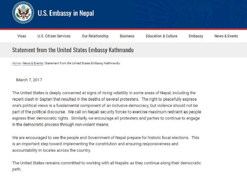 \"\"काठमाडाैं, २४ फागुन । सप्तरीमा भएको घटनाप्रति अमेरिकाले चिन्ता व्यक्त गरेको छ । काठमाडौंस्थित अमेरिकी दूतावासले मंगलवार (आज) एक विज्ञप्ति जारी गर्दै घटनाप्रति चिन्ता व्यक्त गरेको हो । साथै अमेरिकाले संयमता अपनाउन आग्रहसमेत गरेको छ । मधेसी मोर्चा र अन्य राजनीतिक दलहरूलाई अहिंसात्मक रूपमा लोकतान्त्रिक प्रक्रियामा संलग्न रहन आग्रह गरेको जारी गरेको विज्ञप्तिमा उल्लेख गरिएको छ ।