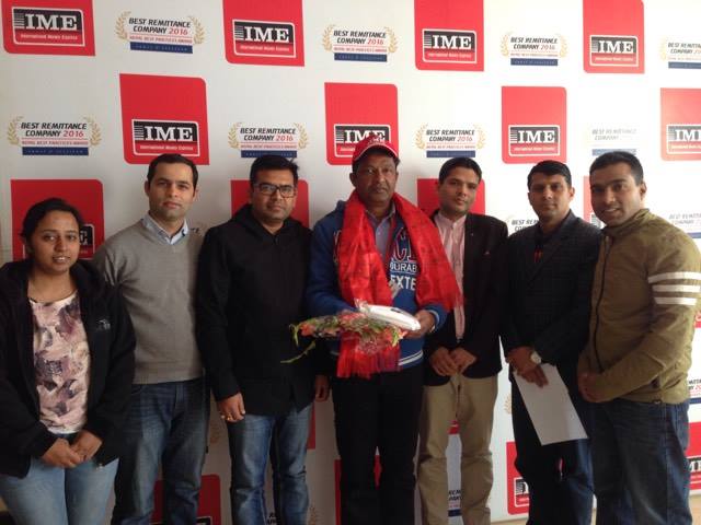\"\"काठमाडौं, २७ फागुन । कतारस्थि तरिया मनी ट्रान्सफरको संजालमा आवद्ध नेशनल एक्सचेन्जबाट आईएमईमार्फत् पैसा पठाउँदा निसान सन्नी ब्राण्डको गाडी उपहार पाउने ज्ञानबहादुर क्षेत्रीलाई आईएमईले सम्मान गरेको छ । क्षेत्रीले गतमहिना नेपाली रुपैयाँ १ लाख २० हजार रुपन्देहीस्थित आफ्नो घरमा पठाउनु भएको थियो । बुटवलस्थित आईएमईको व्यावसायीक साझेदार संस्था तिनाउ विकास बैंकबाट उक्त रकम प्रदान गरिएको । आईएमईमा कार्यरत कर्मचारीहरुको उपस्थितीमा आईएमई केन्द्रीय कार्यालय पानीपोखरीका वरिष्ठ प्रवन्धकद्वय रुद्रराज पौडेल र खिलेन्द्र पौडेलले संयुक्त रूपमा क्षेत्रीलाई सम्मान गरेका थिए । आफ्नो स्थापना देखिनैे रेमिटेन्स सेवालाई प्रत्येक नेपालीको पहुँचसम्म पु¥याउन प्रतिबद्व कम्पनीले सेवा शुभारम्भको १६ औँ वर्षसम्ममा नेपालका शहरी तथा ग्रामिण क्षेत्रलाई समेट्ने गरी ७५ जिल्लाका ५ हजार ७ सय सयभन्दा बढी सव–एजेन्ट र बैंक तथा वित्तीय संस्थाका शाखामार्फत विदेशमा कार्यरत नेपालीहरुले कमाएको रकम देशका विभिन्न भूगोलमा छिटो, छरितो, विश्वसनीय र सुरक्षिततवरबाट वितरण गर्दै आईरहेको छ ।
