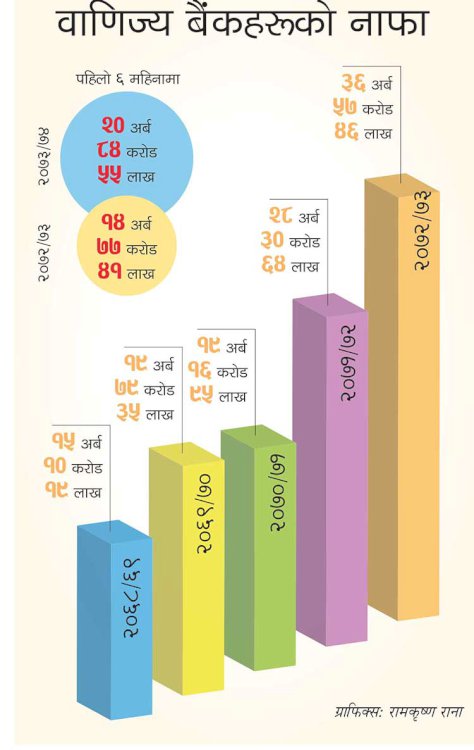 \"\"काठमाडौं, ३ चैत । वाणिज्य बैंकहरूले चालू आर्थिक वर्षको पहिलो ६ महिनामा विगत एक वर्षको भन्दा बढी नाफा कमाएका छन् । आर्थिक वर्ष २०७०/७१ मा १९ अर्ब १६ करोड ९५ लाख नाफा कमाएका वाणिज्य बैंकहरूले चालू आवको पहिलो ६ महिनामा २० अर्ब ८४ करोड ५५ लाख नाफा कमाएका छन् । यस वर्ष ‘क\' वर्गका बैंकले कमाएको नाफा गएको वर्षको सोही अवधिको भन्दा ४१ प्रतिशतले बढी हो । गएको वर्ष पहिलो ६ महिनामा वाणिज्य बैंकहरूले १४ अर्ब ७७ करोड ४१ लाख रुपैयाँ नाफा कमाएका थिए । आजको अन्नपूर्ण पोस्टमा खबर छ– भूकम्प र नकाबन्दीका कारण अधिक तरलता खेपीरहेका बैंकहरूले त्यसपछिका दिनमा लगानी बढाउँदा नाफा बढ्न थालेको हो । वित्तीय क्षेत्र विभिन्न व्यवसायमध्ये पारदर्शी र नियामक निकायको निर्देशनमा रहेर कार्य सम्पादन गर्ने क्षेत्र भएकाले पनि यसको प्रभाव राम्रो देखिएको नेपाल बैंकर्स एसोसिएसनका अध्यक्ष अनिलकेशरी शाह बताउँछन् । वित्तीय क्षेत्रको नाफा बढ्नुको श्रेय राम्रो र क्षमतावान जनशक्तिमा जाने अध्यक्ष शाहले बताए । ‘बर्सेनि नाफा बढ्दै जानु यस क्षेत्रका लागि सकरात्मक र आम जनताको विश्वास जित्दै जानु हो\', उनले भने । ‘बैंकले मात्र नाफा बढाएर नहुने बैंकसँगसँगै अन्य सबै क्षेत्रले नाफा बढाएमा मात्र नेपालले दिगो आर्थिक वृद्धिदर हासिल गर्न सक्ने शाहले बताए । ‘नेपाल विकासशील देश बन्न पनि बैंक तथा वित्तीय क्षेत्रले मात्र नाफा बढाएर हुँदैन\', उनले भने । लगानी भएका हरेक क्षेत्रबाट राम्रो प्रतिफल आउनुपर्ने उनको भनाइ छ । उनका अनुसार पछिल्लो समय लगानीका क्षेत्र विस्तार हुँदै जानुले पनि नाफा बढ्न सहयोग पुगेको हो । कृषि, ऊर्जा, उत्पादनमूलक, हायर पर्चेज, घरजग्गा, अटोलगायतका कर्जा बढ्दै गएको छ । छोटो समयमा पुँजी परिचालन भइरहेकोे छ । त्यस कारणले पनि नाफा बढेको सम्बन्ध क्षेत्रका विज्ञहरूले बताउँदै आएका छन् । आर्थिक वर्ष २०६८/६९ मा १५ अर्ब १० करोड १९ लाख नाफा कमाएका बैंकहरूले गएको वर्ष २०७२/७३ सम्म आइपुग्दा १४२ प्रतिशतभन्दा बढीले नाफा वृद्धि गरेका छन् । गएको वर्ष वाणिज्य बैंकहरूले ३६ अर्ब ५७ करोड ४६ लाख नाफा कमाएका थिए । बढ्दो महँगीको सकारात्मक असर बैंकको नाफामा देखिएको छ । भारतको अघोषित नाकाबन्दीको समयमा बढेको बजार भाउ नाकाबन्दी खुलेपछि पनि नियन्त्रण नहुँदा बैंकहरूको नाफा उच्च भएको हो । व्यापारमा गएको कर्जाकै कारण बैंकको नाफा उच्च भएको बैंकर्स बताउँछन् । अन्य क्षेत्रको कर्जाभन्दा व्यापारको कर्जाबाट बढी नाफा कमाउन सकिन्छ । किनकि यस्तो कर्जा छोटो अवधिको हुन्छ । यसले गर्दा पुँजी घुमिरहेने र यस्तो पुँजीले बढी नाफा दिने बंैकर्सले बताएका छन् । पोहोर, परार बैंक अधिक तरलताको अवस्थामा थियो । उद्योग क्षेत्रमा 
