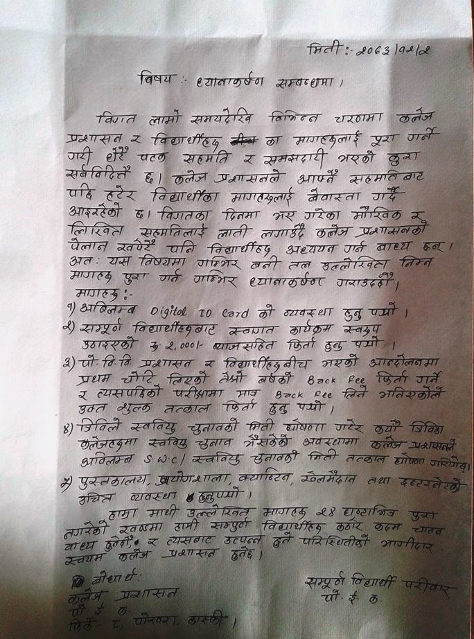 \"\"पोखरा, ३ चैत । पोखरा ईन्जिनियरिङ कलेजका विद्यार्थीहरुले बुधबार क्याम्पस प्रशासन समक्ष पाँच बुँदे मागपत्र बुझाएका छन् । आफ्ना जायज मागहरु सम्बोधन नभए बिहिबारबाट आन्दोलनमा जाने संघर्ष समितिका एक अगुवा मनोज गिरीले बताए । विद्यार्थीहरुले कलेजसमक्ष डिजिटल परिचयपत्रको व्यवस्था हुनुपर्ने, स्वागत कार्यक्रमको नाममा उठाइएको रकम व्याजसहित फिर्ता हुनुपर्ने, रिटेक शुल्क फिर्ता हुनुपर्ने, स्ववियु निर्वाचनको मिति घोषणा गरिनुपर्ने र पुस्तकालय, खेलमैदान, प्रयोगशाला, छात्रावास तथा इन्टरनेटको उचित प्रबन्ध गरिनुपर्ने लगायतका मागहरु राखेका छन् । संघर्ष समितिका अर्का नेता संकल्प ढुंगानाका अनुसार कलेजले गत तीन वर्षदेखि विद्यार्थीहरुलाई स्वागत कार्यक्रमको नाममा फि उठाएपनि स्वागत कार्यक्रम भने गरेको छैन । उनले खबरडबलीसँग भने,“ इन्जिनियरिङ कलेजमा आजसम्म विद्यार्थी परिचयपत्र कागजको बोकेर हिड्नु जस्तो लाजमर्दाे व्यंग्य के हुन सक्छ ?”