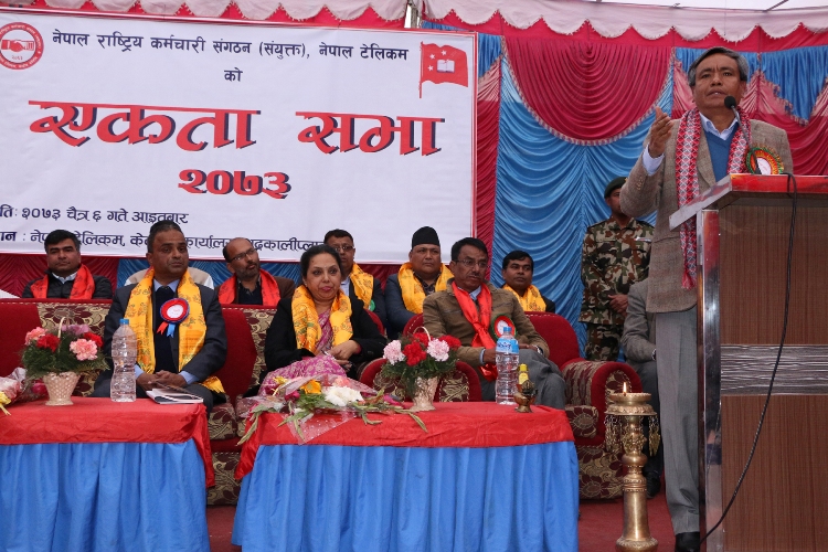 \"\"काठमाडौं, ६ चैत । नेपाल राष्ट्रिय कर्मचारी सङ्गठन र राष्ट्रिय कर्मचारी सङ्गठन टेलिकमको एकता सभा आइतबार सम्पन्न भएको छ । कर्मचारी सङ्गठन टेलिकमको एकता घोषणा सभालाई सम्बोधन गर्दै सूचना तथा सञ्चारमन्त्री सुरेन्द्रकुमार कार्कीले मुलुकको प्रतिष्ठासँग जोडिएको नेपाल टेलिकमको सेवालाई गुणस्तरीय र प्रतिस्पर्धी बनाइनुपर्ने खाँचो आँैल्याए । उनले टेलिकमको क्षमता विस्तार गरी विकासमूलक क्षेत्रमा लगानी गर्नुपर्नेमा जोड दिए । नेपाल टेलिकमलाई थप सुदृढ गरी पैसा कमाउने ‘सिस्टर अर्गनाइजेसन’ खोलेर ‘फ्रिज’ भएको रकम सदुपयोग गर्न जरुरी रहेको उनले बताए । अहिले यो प्रतिस्पर्धीविहिन रहेको र अन्य कम्पनी आउने तयारीमा रहेकाल उनीहरु भन्दा अब्बल बनाउन सबैखाले आधार तयार गर्नुपर्नेमा सञ्चारमन्त्री कार्कीले जोड दिए । टेलिकमले अन्तर्राष्ट्रिय उडान भर्ने विमान र ठूला प्राविधिक विश्वविद्यालयमा लगानी गर्ने क्षमता विस्तार गर्न जरुरी भएको पनि उनले उल्लेख गरे । मन्त्री कार्कीले कर्मचारी सङ्गठनको एकतालाई संस्था सबलीकरण र सुदृढीकरणमा जोड्न सके संस्था तथा मजदुर कर्मचारीको हित हुने विश्वास पनि व्यक्त गरे । नेकमा (माओवादी केन्द्र) र रामबहादुर थापा बादलसँग एकतामा गएका कर्मचारी सङ्गठनबीचको एकतापछि नेपाल राष्ट्रिय कर्मचारी सङ्गठन (संयुक्त) नामकरण गरिएको छ । यज्ञ बजगाईं संयोजक र बाबुजी पण्डित सहसंयोजक रहेको २१ सदस्यीय तदर्थ समिति गठन गरी आगामी वैशाख ७ देखि ९ गतेसम्म सङ्गठनको अधिवेशन गरिने भएको छ ।