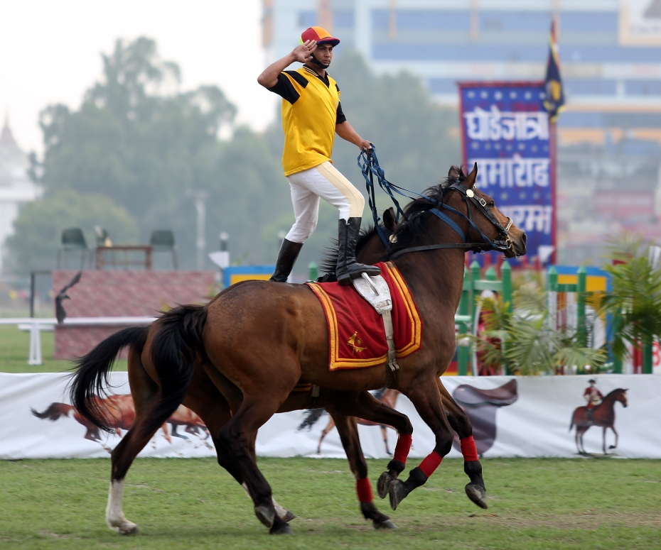 \"\" काठमाडौं, १४ चैत । विगतका वर्षहरुमा जस्तै यसपाली पनि सोमवार काठमाडौंको टुँडिखेलमा नेपाली सेनाले घोडाको कला देखायो । काठमाडौंमा घोडेजात्रालाई विशेष उत्सवकै रुपमा मनाइन्छ । राजमहाराजाहरुले घोडेजात्रालाई उत्सवका रुपमा मनाउने चलन चलाएका थिए । त्यसलाई गणतन्त्रमा पनि निरन्तरता दिइएको छ । घोडेजात्राको दिन टुँडिखेलमा घोडाको कला हेर्न राजधानीका विभिन्न ठाउँबाट मानिसहरुको भीड लाग्थ्यो । त्यही मेला हेर्नकै लागि काठमाडौमा घोडेजात्रामा सार्वजनिक विदा दिने गरिएको थियो । अहिलेको सरकारले पनि अन्य सार्वजनिक विदाहरु कटौती गरे पनि घोडेजात्राको विदालाई भने निरन्तरता दिएको छ । प्रत्येक वर्ष चैत कृष्ण औँसीका दिन काठमाडौंमा घोडेजात्रा मनाउने चलन रहिआएको छ । सो अवसरमा नेपाली सेनाले घोडा दौड तथा विभिन्न अश्वकला प्रदर्शन गरेको थियो । \"\"सेनाद्वारा टुँडिखेलमा आयोजित समारोहमा टाँगन घोडा दौड, चार्जर घोडा दौड, भल्टिङ एनड एक्रोब्याटिक्स, क्याभल्री राइड, क्रस टेन्ट पेगिङ, हर्स बल, म्युजिकल राइड, क्रस कन्ट्रीलगायत अश्वकला प्रदर्शन गर्यो । सदाझैं नेपाली सेनाले टुँडिखेलमा घोडा दगुराएर सोमवार कला देखायो । अश्वकला हेर्न विगतमा उपस्थित हुने राजा महाराजाजस्तै यसपाली राष्ट्रपति, उपराष्ट्रपति उपस्थित भए । \"\"प्रधानमन्त्री प्रचण्ड भने चीन भ्रमणमा गएका कारण उनी उपस्थित भएनन् । साता ब्यापी चीन भ्रमणमा गएका प्रचण्डले बरियता विवादले गर्दा कार्यबाहक प्रधानमन्त्रीको जिम्मेवारी नदिँदा उपप्रधानमन्त्रीहरु टुँडिखेल गएनन् । प्रधानमन्त्री नगएपछि टुँडिखेलमा प्रधानमन्त्रीको सिट खाली थियो । घोडाको जात्रा हेर्न राष्ट्रपति विद्यादेवी भण्डारी, उपराष्ट्रपति नन्दबहादुर पुन, प्रधानन्यायाधीश सुशीला कार्की, प्रधानसेनापति राजेन्द्र क्षेत्री भने उपस्थित थिए । \"\"घोडा दौडमा उत्कृष्ट प्रदर्शन गर्ने प्रतियोगीलाई राष्ट्रपति विद्यादेवी भण्डारीले पुरस्कृत गरेकी थिइन् । सिंहदरबारस्थित सेनाको ‘श्री नेपाल क्याभलरी’ युनिटले प्रत्येक वर्ष घोडेजात्राका अवसरमा घोडा दौड तथा विभिन्न अश्वकला प्रदर्शन गर्दै आएको छ । विसं १९०६ मङ्सिर ७ गते ‘रिसल्ला’ नामबाट स्थापित क्याभलरीले स्थापनाकालदेखि नै विभिन्न राजकीय तथा सैनिक समारोह र उत्सव गर्दै आएको छ ।