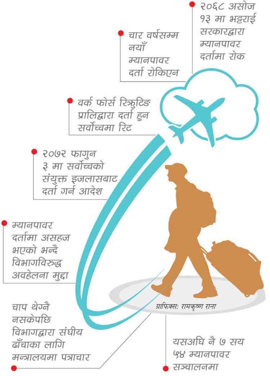 \"\"काठमाडौं, २१ चैत । सरकारले पाँच वर्षअघि नयाँ म्यानपावर दर्तामा रोक लगाए पनि सर्वोच्च अदालत, उच्च अदालत र श्रम मन्त्रालयको सिफारिसमा गत वर्ष मात्रै ८० वटा म्यानपावर कम्पनी दर्ता भएका छन् । अाजको अन्नपूर्ण पोस्टमा खबर छ– बाबुराम भट्टराई नेतृत्वको सरकारले २०६८ असोज १३ मा नयाँ म्यानपावर दर्तामा रोक लगाए पनि प्रधानन्यायाधीश कल्याण श्रेष्ठसहितको संयुक्त इजलासले गत वर्ष फागुन ३ मा प्रक्रिया पुर्‍याएका कम्पनीलाई पेसा/व्यवसाय गर्न रोक नलगाउन फैसला गरेको थियो । नयाँ म्यानपावर दर्ता प्रक्रिया रोकेको पाँच वर्षसम्म पनि सरकारले दर्ता प्रक्रिया खुला गर्ने वा बन्द गर्ने भनेर निर्णय गर्न नसक्दा अदालत र मन्त्रीको सिफारिसमा नयाँ म्यानपावर दर्ता भइरहेको जानकारी वैदेशिक रोजगार विभागका महानिर्देशक विश्वराज पाण्डेले दिए । ‘दर्ताप्रक्रिया खुला नभए पनि पछिल्लो समय नयाँ म्यानपावर दर्ता भइरहेका छन्\', पाण्डेले भने, ‘सर्वोच्च अदालत, उच्च अदालत र मन्त्रालयको सिफारिसमा ८० भन्दा बढी म्यानपावर दर्ता भएका हुन् ।\' भट्टराई नेतृत्वको सरकारले वैदेशिक रोजगार ऐन, २०६४ को दफा ८२ अनुसार नयाँ म्यानपावर दर्ता बन्द गर्ने निर्णय गरेको थियो । सरकारले नयाँ म्यानपावर दर्ताप्रक्रियामा कुनै चासो नदेखाएको भन्दै दर्ताका लागि सबै प्रक्रिया पूरा गरेको वर्क फोर्स रिक्रुटिङ प्रालिले दर्ता रोकिएको चार वर्षपछि सर्वोच्च अदालतमा नयाँ म्यानपावर दर्ता गरिपाऊँ भन्दै रिट दायर गरेको थियो । उसले रिटमा संविधानले दिएको पेसाव्यवसाय गर्न पाउने संवैधानिक हकविरुद्ध सरकारले नयाँ म्यानपावर दर्ता बन्द गराएको उल्लेख थियो । सोही रिटमा २०७२ फागुन ३ मा तत्कालीन प्रधानन्यायाधीश श्रेष्ठसहितको संयुक्त इजलासले प्रक्रिया पुर्‍याएर आएका म्यानपावर दर्ता गर्नुपर्ने फैसला गरेको थियो । सोही फैसलामा टेकेर अन्य व्यवसायीले पनि अदालतबाट मुद्दा जित्दै म्यानपावर दर्ता गराइरहेको विभागका महानिर्देशक पाण्डेले बताए । म्यानपावर दर्तामा असहज भएको भन्दै केही अघि विभागकै विरुद्ध केही व्यक्तिले अदालतमा अवहेलना मुद्दासमेत दायर गरेपछि विभागले नयाँ म्यानपावर दर्तामा रोकतोक नगरेको जानकारी पाण्डेले दिए । अवहेलना मुद्दामा सर्वोच्चले परमादेश जारी गर्दै दर्ताप्रक्रिया नरोक्न फेरि विभागलाई बाध्यकारी आदेश दिएको थियो । योसँगै अदालतले अबउप्रान्त यो विषयमा रिट गर्ने नपर्ने गरी फैसला गरिदिएकै कारण प्रक्रिया पुर्‍याएर आएका व्यवसायीको म्यानपावर दर्ता गर्नैपर्ने अवस्था उत्पन्न भएको पाण्डेले बताए । नयाँ म्यानपावर दर्ताको चाप थेग्नै नसक्ने भएपछि विभागले फागुन अन्त्यमा देश संघीय संरचनामा गइसकेको अवस्थामा म