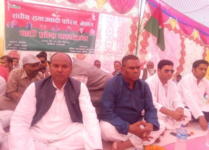 \"\"रुपन्देही, १ बैशाख । आउँदो बैशाख ३१ गतेको स्थानीय तहको निर्वाच्न नजिकिँदै गर्दा तराईमा उपेन्द्र यादव नेतृत्वको संघीय समाजवादी फोरम नेपाल पार्टीमा प्रवेश गर्नेको लर्को नै लागेको छ । विजय गच्छदार नेतृत्वको मधेसी जनअधिकार फोरम लोतान्त्रिक पार्टी परित्याग गरी केन्द्रीय सदस्य मोहनलाल यादव, क्षेत्रीय अध्यक्ष विरेन्द्र कुर्मी फोरम नेपालमा प्रवेश गरेका छन् । नेपाली कांग्रेस, नेकपा एमाले, नेकपा माओवादी केन्द्र, राप्रपा, फोरम लोकतान्त्रिकलगायत विभिन्न पार्टी परित्याग गरि फोरम नेपालमा प्रवेश गरेका हुन् । रुपन्देहीको क्षेत्र ५, सूर्यपुरामा आयोजित बृहत् पार्टी प्रवेश तथा सभामा उनीहरुसँगै करिब ५ सय नेता÷कार्यकर्ता प्रवेश गरेका छन् । संघीय समाजवादी फोरम नेपाल रुपन्देहीका जिल्ला उपाध्यक्ष रामअवतार यादवका अनुसार राप्रपा जिल्ला उपाध्यक्ष हरि पाल, जिल्ला युवा अध्यक्ष सुरेन्द्र धवल, जिल्ला युवा उपाध्यक्ष बिपिन कुर्मी, नेत्र विक्रम चन्द विप्लव नेतृत्वको पार्टीका जिल्ला सदस्य बाबुलाल पाल र फोरम लोकतान्त्रिकका क्षेत्रीय सचिव बेचु केवट, कबिता थारु र रुपा यादवलगायत कांग्रेस, एमाले र माओवादीबाट प्रवेश गरेका छन् ।