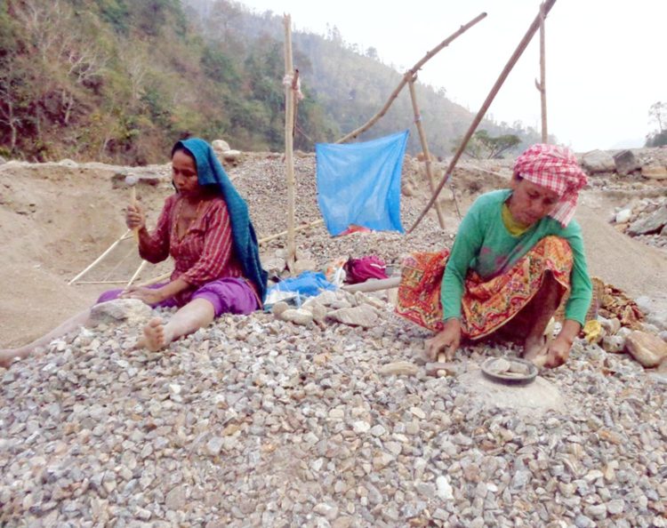 \"\"इलामको माईखोला नजिकै निर्माण हुँदै गरेको विद्युतका लागि गिट्टी कुट्दै महिलाहरू । तस्विरः गोविन्द लामिछाने/इलाम रासस