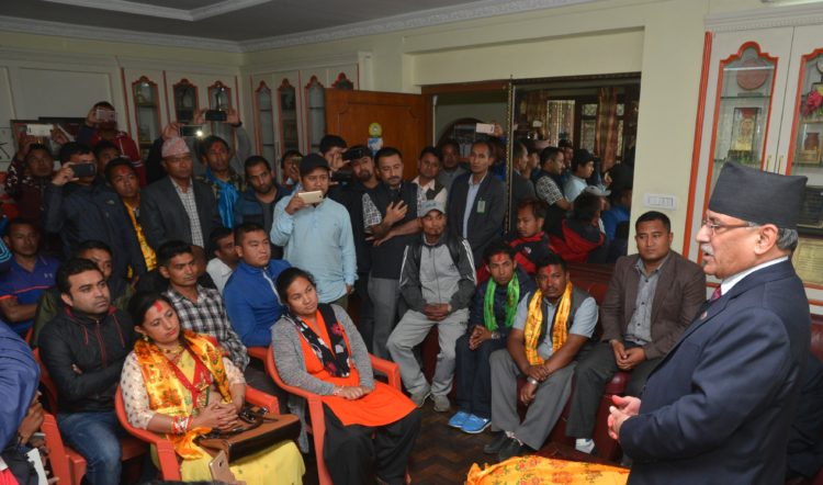 \"\"काठमाडौं, १८ वैशाख । विभिन्न पार्टी परित्याग गरी दर्जनौं माओवादी केन्द्रमा प्रवेश गरेको छन् । सोमबार माओवादी केन्द्र प्रवेश गर्ने नेताहरुलाई प्रधानमन्त्री एवं माओवादी केन्द्रका अध्यक्ष पुष्पकमल दाहाल ‘प्रचण्ड’ले लाजिम्पाटमा आयोजित एक कार्यक्रमकाबीच पार्टी प्रवेश गराएका हुन् । नेपाली कांग्रेस सिन्धुपाल्चोकका नेता बुद्धराज बस्नेत र नेकपा (एमाले)की नेतृ दुर्गा नेपाल, संघीय समाजवादीका रामसिंह लामा, ताम्सालिङ नेपाल राष्ट्रिय दलका राजन योञ्जनसहितका दर्जनौं नेता विभिन्न पार्टी परित्याग गरी नेकपा माओवादी केन्द्रमा प्रवेश गरेका छन् । विभिन्न पार्टी परित्याग गरी नवआगन्तुक नेताहरुलाई स्वागत गर्दै प्रचण्डले भने, ‘हिजो महाअभियोग दर्ता भएपछि राजनीतिमा एक खालको तरङ्ग आएको छ । तर, महाअभियोगको आफ्नो प्रक्रिया छ, त्यो संसदीय प्रक्रियामा जान्छ । यसले निर्वाचनमा कुनै असर गर्दैन । भोलि मनोनयन दर्ता हुन्छ र ३१ गते पहिलो चरणको निर्वाचन हुन्छ, यसमा कुनै भ्रम पाल्न जरुरी छैन । तपाईहरु पनि सबै भ्रममा नपरी भोलिको मनोनयनमा सहभागी हुनुहोस् ।’ निर्वाचनलाई उत्सवका रुपमा मनाउन अपील गर्दै प्रचण्डले भने, ‘मनोनय दर्ता भएपछि भोलिबाट निर्वाचनबारे सबै अन्यौल हट्छ, तपाईहरु सबै निर्वाचनमा होमिनुस्, महाअभियोगले निर्वाचनमा कुनै असर गर्दैन । पहिलो चरणको निर्वाचनसम्म संशोधन विद्येयक अघि नबढे पनि यसले चुनावलाई कुनै असर पर्दैन, मधेसी मोर्चा पनि पहिलो चरणको निर्वाचनमा सहभागी हुन्छ । स्वस्थ ढंगले निर्वाचनमा प्रतिस्पर्धा गरौं ।’ नेपाली कांग्रेसमा २७ वर्षभन्दा लामो राजनीति गरेका नेपाली कांग्रेसका जिल्ला सचिवालय सदस्य बस्नेतले भने, ‘अहिलेको समस्याको समाधान गर्ने हैसियत माओवादीबाहेक अरु शक्तिसँग छैन, समृद्धि र विकासको योजना पनि माओवादीसँग मात्रै छ, त्यसैले माओवादीमै भएएर राजनीतिक र सामाजिक सेवा गर्ने सोंचमा पुगें । अब हामीले माओवादी केन्द्रलाई सिन्धुपाल्चोक जिल्लाका सबै नगर, गाउँपालिका र वडामा विजय बनाएर देखाउँछौं ।’ बस्नेत कांग्रेस जिल्ला सभापतिमा यसअघि झिनो मतले पराजित भएका थिए । उनी तातोपानी नाका सम्बद्ध व्यापारीसमेत हुन् ।