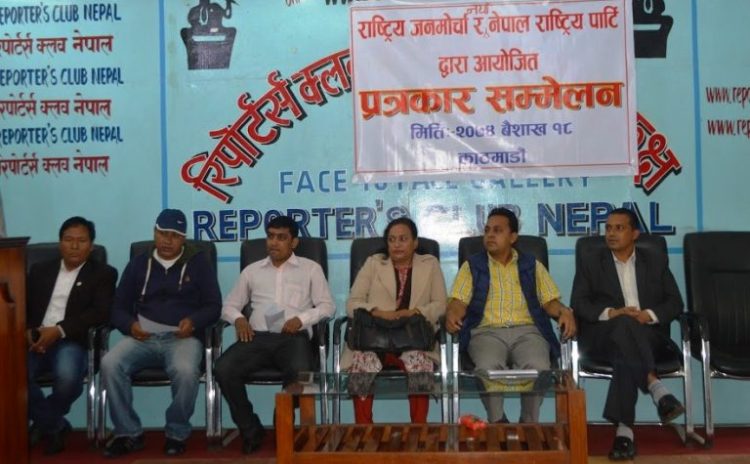 \"\"काठमाडौं, १८ वैशाख । राष्ट्रिय जनमोर्चा र नयाँ नेपाल राष्ट्रिय पार्टी बीच एकता भएको छ । अन्तराष्ट्रिय श्रमिक दिवसको अवसरमा सोमबार रिपोर्टर्स क्लब नेपालमा पत्रकार सम्मेलन गरेर दुई पार्टीहरुवीच एकताको घोषणा गरेका छन् । जनमोर्चाकी नेता एवम सांसद दुर्गा पौडेलले सरकारले ल्याएको परिमार्जनसहितको संशोधन प्रस्तावलाई राष्ट्रिय हितको विपरितमा रहेको आरोप लगाएकी छिन् । उनले भनिन्,‘आज हाम्रो देशले निक्कै दर्दनाक स्थितिको सामना गरिरहेको छ, तर सरकारले यस्तो स्थितिमा नगर्ने काममा हात हालिरहेको छ, प्रधानन्यायाधीशलाई महाअभियोग लगाउन हाम्रो सरकार व्यस्त छ, निर्वाचनको समयमा यस्ता अनेकन नचाहिने नाटक देखाएर दुनियाँ हसाई रहेको छ, यी कुराहरु राष्ट्रिय जनमोर्चालाई कदापि स्विकार्य छैन्, राष्ट्रियतालाई कुर्सीसँग साट्न हामी तायार छैनौँ, बरु जुनसुकै मूल्य चुकाउन तयार छौँ।’ त्यस्तै कार्यक्रममा नयाँ नेपालका कार्यबहाक अध्यक्ष पृथ्वी थापाले जनमोर्चाले तयार पारेको घोषणा पत्र, विधान र नेतृत्वलाई स्विकार गर्दै आफ्नो पार्टी एकतामा आएको बताए । उनले भने,‘हाम्रो पार्टी र राष्ट्रिय जनता पार्टी यो देशमा नभएको भए संघियताका नाममा देश विभाजनतर्फ उन्मुख हुनेथियो तर हामीले त्यो हुन दिएनौ, यसको एकमात्र उदाहरण जातीय राज्य र क्षेत्रिय राज्य हो, जनताले कदापि पनि यस्तो हुनदिने छैनन् ।’ जनमोर्चाका नेता आनन्द शर्माले देश जर्जर अवस्थामा गुर्जिरहेको बताउँदै सबैलाई गम्भिर हुनु आग्रह गरेका छन् । नेता शर्माले राष्ट्रियता, जनतन्त्र, जनजिविका, विद्यमान राजनीति, सामाजिक स्थितिलाई ध्यानमा राखेर आगामी निर्वाचनमा राष्ट्रिय जनमोर्चालाई जनताले शक्तिशालि पार्टी बनाउने समेत बताए । कार्यक्रममा राष्ट्रि जनमोर्चा तथा नयाँ नेपाली राष्ट्रिय पार्टीका नेता कार्यकर्ताले नेपालमा श्रमिकहरू स्थितिका बारेमा चिन्ता व्यक्त गरेका थिए ।