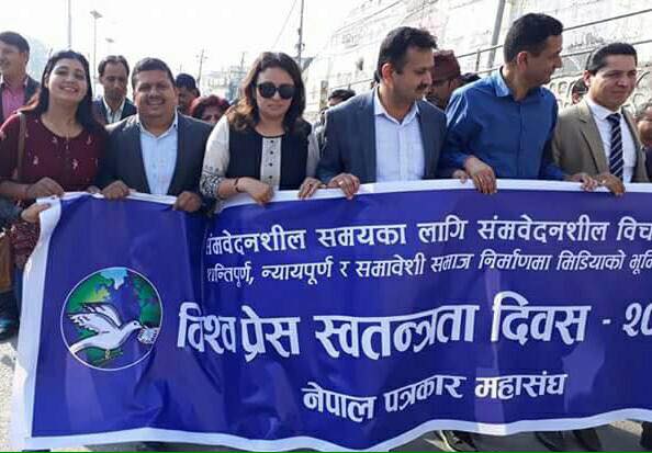 \"\"काठमाडौँ, २० वैशाख । नेपाल पत्रकार महासङ्घले विश्व प्रेस स्वतन्त्रता दिवसका अवसरमा आज प्रभातफेरि गरेको छ । ‘संवेदनशील समयका लागि संवेदनशील विचार शान्तिपूर्ण, समावेशी र न्यायपूर्ण समाजमा मिडियाको भूमिका’ नाराका साथ नयाँ बानेश्वरबाट सुरु भएको प्रभातफेरि माइतीघर मण्डलामा आई कोणसभामा परिणत भएको थियो । कोणसभालाई सम्बोधन गर्दै महासङ्घका अध्यक्ष डा महेन्द्र विष्टले अझै पूर्ण प्रेस स्वतन्त्रता प्रत्याभूति गर्न नसकेको बताए । उनले संविधानमा प्रेस स्वतन्त्रता उल्लेख गरे पनि विभिन्न बहानामा प्रेसमाथि आक्रमण भइरहेको बताए । “दोषीलाई कारबाही नहुनु, पत्रकारमाथि आक्रमण गर्नेमाथि छानबिन नहुने जस्ता प्रेस स्वतन्त्रता उल्लंघनका घटना बढेका छन्”, उनले भने“प्रवृत्तिगतरुपमा प्रेस स्वतन्त्रता उल्लंघनका घटना बढेका छन् । पूर्णरुपमा प्रेस स्वतन्त्रता भन्ने छैन ।” उनले व्यवहारमा प्रेस स्वतन्त्रता नभएकाले पत्रकारले अहिले पनि स्वनियन्त्रणमा समाचार लेख्नु परेको बताए । अध्यक्ष डा विष्टले नेपालमा संवैधानिक दृष्टिले तुलनात्मकरुपमा अहिले प्रेस स्वतन्त्रताको संरक्षण गरिए पनि व्यवहारमा त्यसअनुरुप पत्रकारलाई सुरक्षितरुपमा काम गर्ने वातावरण बन्न नसकेको बताए । पत्रकारितामार्फत मुलुकलाई परिवर्तन सम्भव रहेको भन्दै उनले लोकतान्त्रिक मुलुकमा प्रेस स्वतन्त्रता आवश्यक रहने बताए । उनले अघिल्लो वर्षको तुलनामा प्रेस स्वतन्त्रताका घटनामा कमी आए पनि निर्भिक ढङ्गबाट काम गर्ने वातावरण पत्रकारलाई नभएको जानकारी गराए । महासचिव उजिर मगरले यस वर्ष ७१ वटा प्रेस स्वतन्त्रता उल्लंघनका घटना भएको जानकारी गराए । प्रभातफेरिमा महासङ्घका पूर्वअध्यक्ष धर्मेन्द्र झा, प्रेस युनियनका अध्यक्ष बद्री सिग्देल, प्रेस चौतारी नेपालका पूर्वअध्यक्ष राजेन्द्र अर्याल, प्रेस सेन्टर नेपालका पूर्वमहासचिव ओम शर्मालगायत विभिन्न सञ्चारमाध्यममा कार्यरत पत्रकारको सहभागिता रहेको थियो । उनका अनुसार पत्रकारमाथिको दुव्र्यवहारका १६, पत्रकार पक्राउ ११ र पत्रकारमाथिको आक्रमणका ११ वटा घटना भएका छन् । त्यसैगरी, पत्रकारमाथि धम्कीका सात, सञ्चार क्षेत्रमा क्रियाशील सङ्घसंस्थामा तालाबन्दी तथा कब्जाका सात र छजना पत्रकारलाई समाचार सङ्कलनका क्रममा प्रहरीले केही समय नियन्त्रणमा लिएको जनाइएको छ । रासस