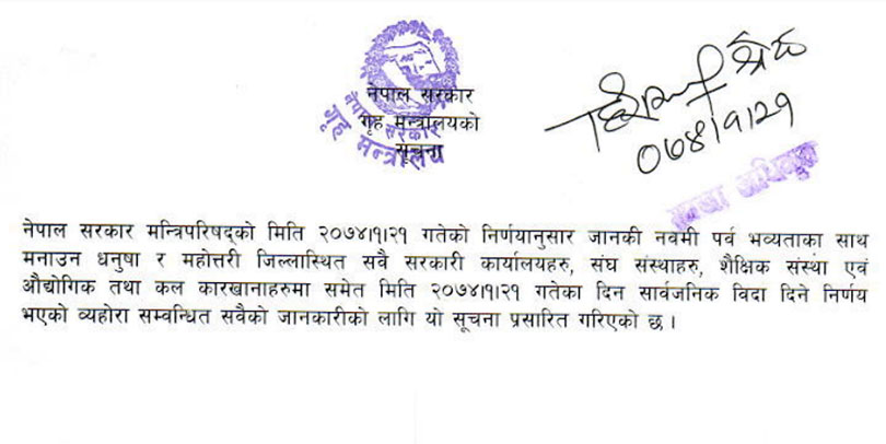 \"\"काठमाडौँ, २१ वैशाख । सरकारले तराईका दुई जिल्लामा सार्वजनिक विदा दिएको छ । गृहमन्त्रालयले जानकी नवमी पर्वको अवसरमा विहिवार आज महोत्तरी र धनुषा जिल्लामा सार्वजनिक बिदा दिएको हो । आज बिशेष महत्वका साथ जानकी नवमी पर्व मनाइने हुँदा सरकारले मन्त्रिपरिषदबाट निर्णय गरी विदा दिएको हो । ती दुई जिल्लास्थित सरकारी कार्यालय, सङ्घसंस्था, शैक्षिक संस्था, औद्योगिक तथा कलकारखानामा समेत सार्वजनिक बिदा दिने निर्णय भएको गृहमन्त्रालयले आज जारी गरेको विज्ञप्तिमा उल्लेख छ ।