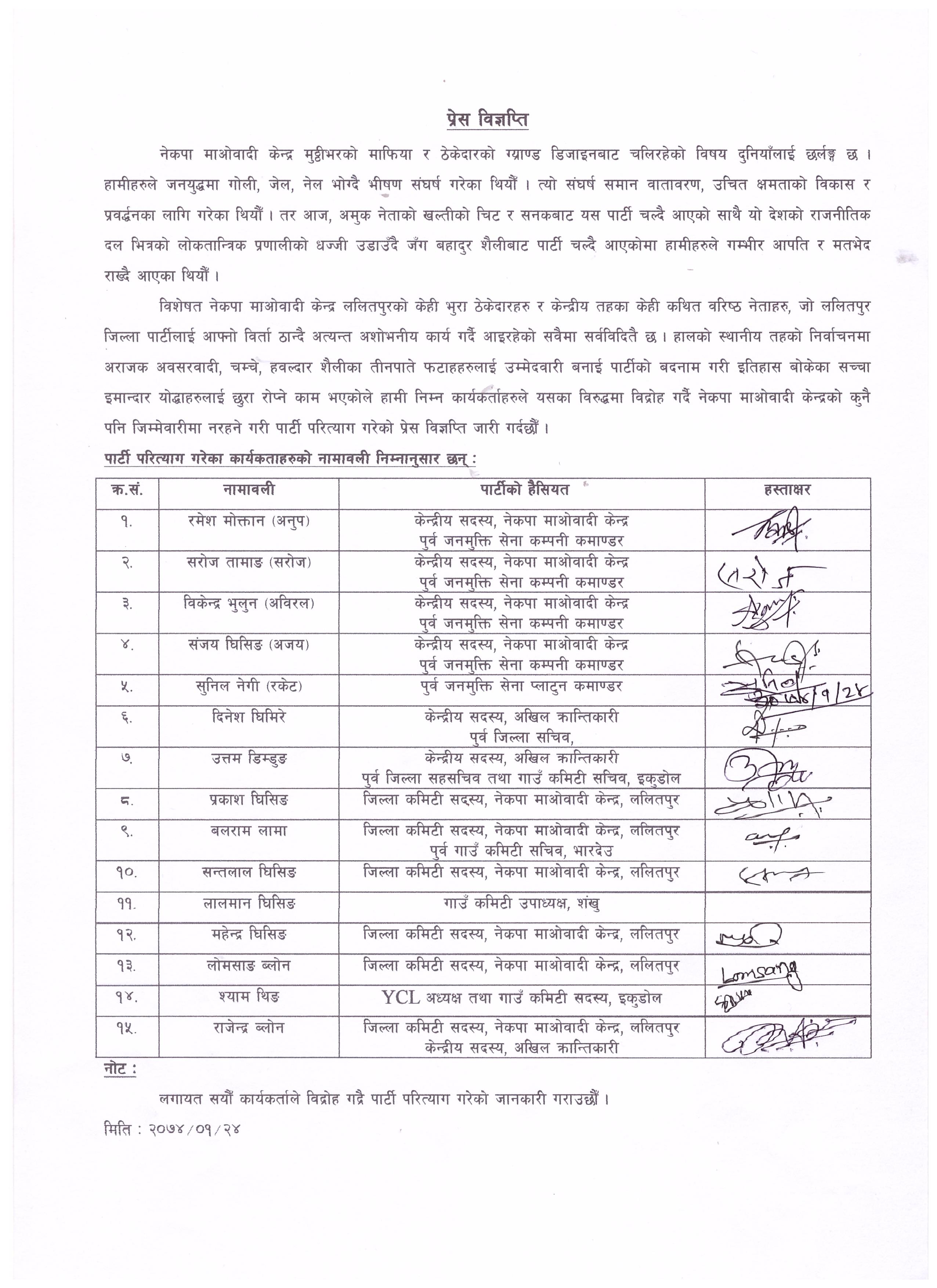 माओवादी केन्द्रका ५ केन्द्रीय सदस्यसहित १५ जनाले दिए राजीनामा