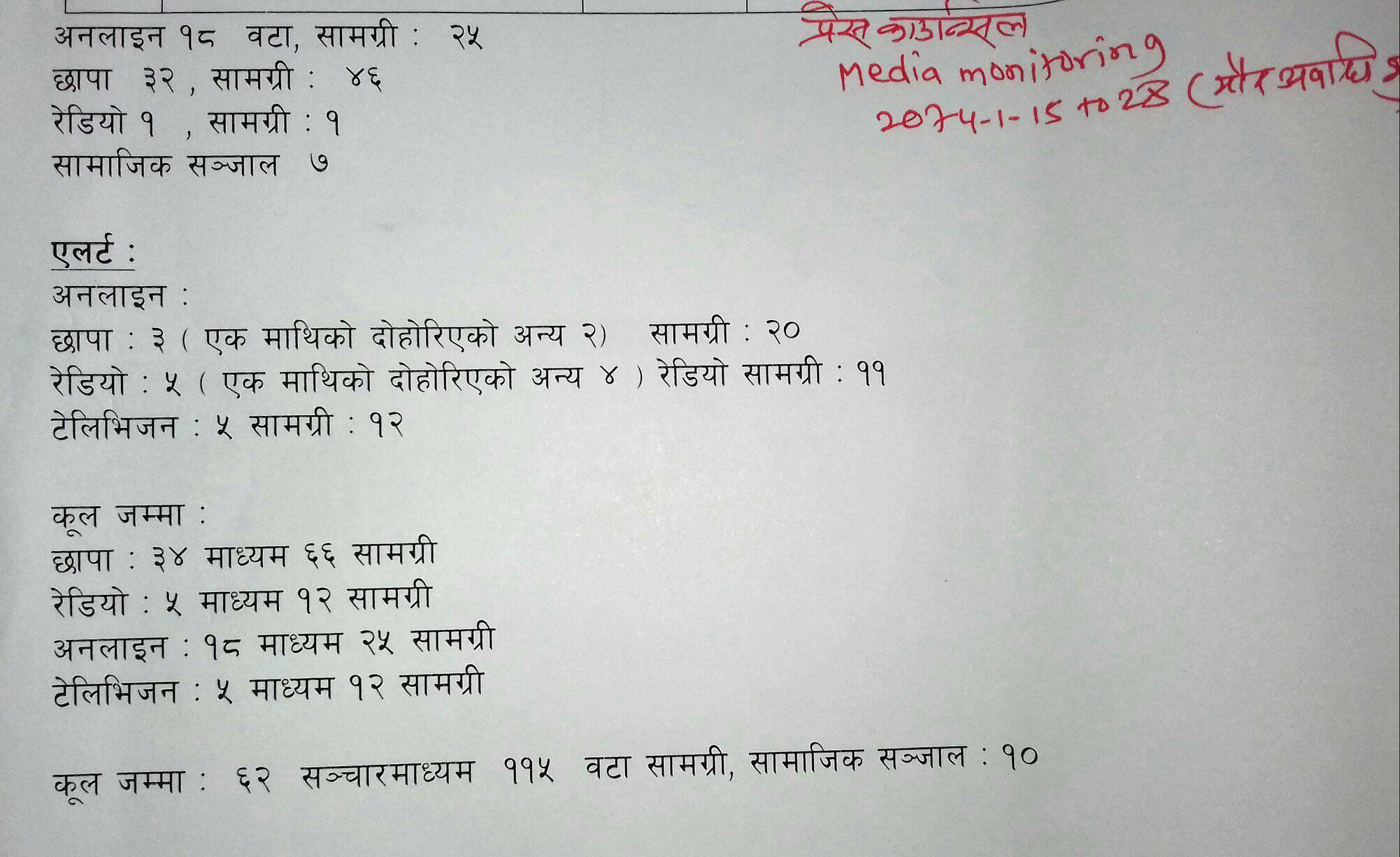 \"\"काठमाडौं, २९ वैशाख । स्थानीय तह निर्वाचन, २०७४ को निर्वाचनको मौनअबधिसम्ममा ६२ सञ्चारमाध्यमका १ सय १५ सामग्रीमा पत्रकार आचारसंहिता तथा निर्वाचन आचारसंहिता उल्लङ्घन भएको पाईएको छ । सामाजिक सञ्जाल फेसबुकमा पोष्ट गरिएका १० दशवटा उल्लङ्घन गर्नेहरुमा परेका छन् । २०७४ वैशाख १५ देखि २०७४ वैशाख २८ गतेसम्मको अबधिमा छापातर्फ ३४ माध्यममा ६६ सामग्री, बिद्युतीयतर्फ १८ अनलाइनका प्रकाशित÷प्रसारित २५ सामग्री, ५ वटा टेलिभिजनका १२ सामग्री र ५ वटा रेडियोका १२ सामग्रीले आचारसंहिता उल्लङ्घन गरेको पाईएको छ — काउन्सिलका मुख्य अधिकृत झविन्द्र भुसालले भने “पत्रकार आचारसंहिता तथा निर्वाचन आचारसंहिताको उल्लघंन गर्ने छापा ३, रेडियो ५, टेलिभिजन ५ वटाको तुरुन्तै एलर्ट गरिएको छ । ” आचारसंहिता आकर्षित भएका विषयवस्तुमा एकपक्षीय तथा सत्य, तथ्य र निष्पक्ष नभएको, निर्वाचन आचारसंहिताले तोकेको समयसीमा अनुरुप विज्ञापन प्रकाशन÷प्रसारण नभएको, निर्वाचनसंगसम्वन्धि सभा, सम्मेलनको प्रत्यक्ष प्रसारण गरेर उल्लङ्घन गरेको पाईएको छ । निर्वाचन आचारसंहिता अनुगमनको जिम्मेवारी पाएको प्रेस काउन्सिल नेपालले गुणात्मक अनुगमन प्रणालीको दैनिकरुपमा र संख्यात्मक अनुगमनको साप्ताहिकरुपमा निर्वाचन आयोगलाई रिपोर्टिङ् गर्दै आएको छ ।
