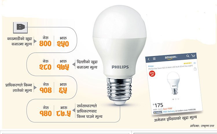 \"\"काठमाडाैं, ३० वैशाख । विद्युत् प्राधिकरणले भारतबाट मगाएर उपभोक्तालाई बिक्री गर्न खोजेको एलईडी चिमको मूल्य विवादित बनाउने प्रयास भइरहँदा नौ वाटको फिलिप्स एलईडी चिमको मूल्य भारतको राजधानी दिल्लीमै प्रतिगोटा एक सय ९० भारु (तीन सय चार रुपैयाँ) पर्ने त्यहाँका बिक्रेताले बताएका छन् । अाजको अन्नपूर्ण पोस्टमा खबर छ– नयाँदिल्लीस्थित द्वारका सेक्टर १२ मा रहेको संकल्प इलेक्ट्रिकल्सका बिक्रेता अविनाश गुप्ताले फिलिप्स ब्रान्डको एलईडी चिमको एक सय ९० भारु पर्ने जानकारी दिए । ‘हामीले फिलिप्सको नौ वाटको एलईडी चिम सबैभन्दा सस्तोमा यही मूल्यमा बेचिरहेका छौं\', गुप्ताले टेलिफोनमा भने । प्राधिकरणले भारतीय सरकारी कम्पनी इनर्जी इफिसेन्सी सर्भिसेस लिमिटेड (ईईएसएल) मार्फत यही ब्रान्ड र यही क्षमताको २ करोड थान चिम आयात गर्दैछ । उक्त चिममा भन्सार महसुल, कर, ढुवानीलगायत शुल्क जोडेर उपभोक्तालाई प्रतिगोटा एक सय ४० रुपैयाँमा वितरण गर्ने योजना प्राधिकरणको छ । नेपालको हेटौंडासम्म प्रतिगोटा ६५ रुपैयाँ भारु (एक सय चार रुपैयाँ) पर्ने यो चिमको मूल्यमा स्थानीय कर र सेवा शुल्क जोडिँदा नेपालका उपभोक्ताका लागि प्रतिगोटा एक सय ४० रुपैयाँसम्म पर्ने प्राधिकरणका कार्यकारीनिर्देशक कुलमान घिसिङले बताए । अर्थात् दिल्लीमा फिलिप्स ब्रान्डको एउटा एलईडी चिमलाई पर्ने मूल्यमा नेपालमा प्राधिकरणले दुईवटा त्यस्तै चिम बिक्री गर्नेछ । काठमाडौंको बजारमा भने फिलिप्स नौ वाटको एलईडी चिमको मूल्य चार सयदेखि पाँच सय रुपैयाँसम्म पर्छ । प्राधिकरणले खरिद गर्न लागेको उक्त एलईडीका लागि ईईएसएलले प्रस्ताव गरेको ६५ भारुको मूल्यमा दुई अर्ब ८० लाख रुपैयाँ तिर्नुपर्नेछ । भारतीय उपभोक्ता मूल्यमा यो परिमाणमा आयात गर्ने हो भने यसको मूल्य ६ अर्ब ८० लाख रुपैयाँ पर्छ । भारतीय उपभोक्ता बजार र प्राधिकरणले बिक्री गर्ने मूल्यबीच प्रतिगोटा एक सय ६४ रुपैयाँको अन्तर छ । यही हिसाबले पनि प्राधिकरणका उपभोक्ताका लागि तीन अर्ब २८ करोड रुपैयाँ लागत बचत हुने देखिएको छ । किन ६५ भारु ? भारतमा सन् २०१७ को मूल्यमा एउटा ९ वाटको फिलिप्स ब्रान्डको एलईडी चिमलाई ३९.५० भारु पर्ने प्राधिकरणलाई उसले पठाएको ‘कोटेसन\' मा उल्लेख छ । उक्त आधार मूल्यमा दुई प्रतिशत ढुवानी खर्च (आपूर्तिकर्ताको गोदामदेखि बन्दरगाहसम्म) र दुई प्रतिशत सीएसटी चार्ज गरी १.६० भारु जोडिएको छ । यसपछि १० प्रतिशतले प्रतिगोटा ४.११ भारु ईईएसएलको प्रशासकीय खर्च, स्थानीय खर्च गरेर ४.११ भारु जोडिएको छ । यसबाहेक आन्तरिक बन्दरगाहदेखि ढुवानी (हेटौंडासम्म) १२ प्रतिशतले प्रतिगोटा ५.४२ भारु, हेटौंडासम्म ढुवानीका क्रममा भएको बिमा दुई प्रतिशत (९० पैसा भारु) गरी याताया