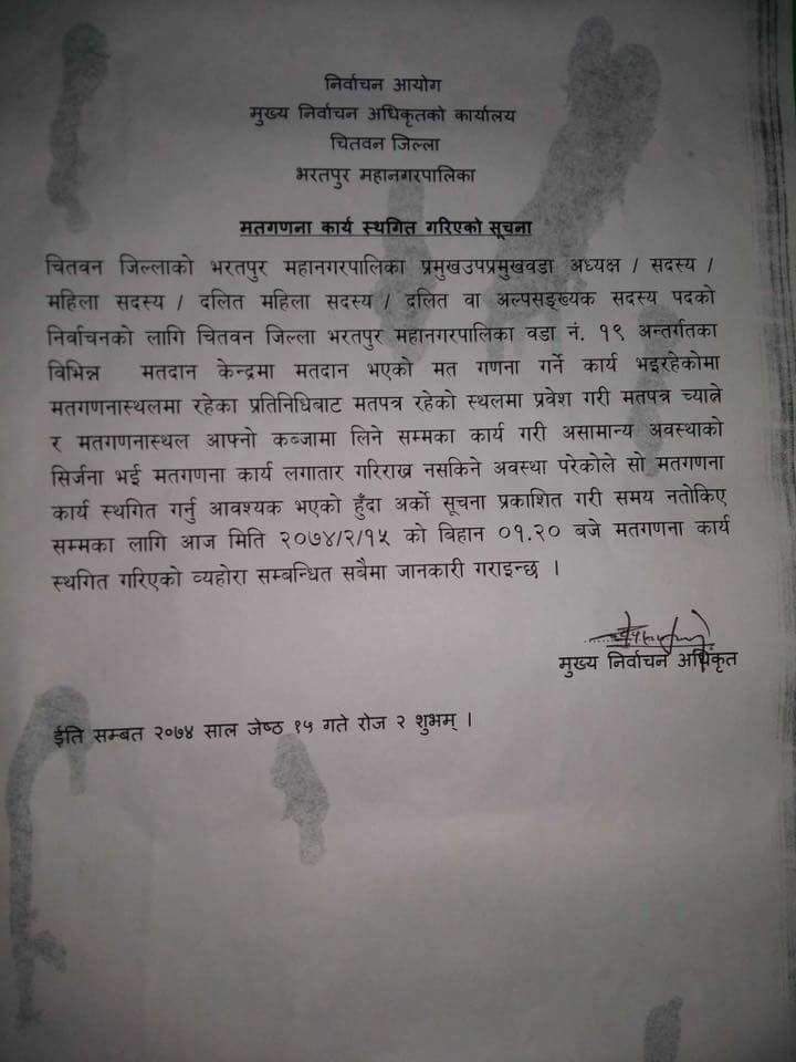 काठमाडौं, १५ जेठ । भरतपुर महानगरपालिकाको मतगणना अनिश्चित समयका लागि रोकिएको छ । मध्यराती मतपत्र च्यातिएपछि उत्पन्न भएको विवादका कारण मतगणना रोकिएको हो । यसैबीच, महानगरपालिकाका मुख्य निर्वाचन अधिकृतले मतगणनास्थलमा रहेका प्रतिनिधि मतपत्र रहेको स्थलमा प्रवेश गरी मतपत्र च्यात्ने काम गरेको र मतगणना स्थल नै कब्जामा लिन खोजेको बताएका छन् । एक विज्ञप्ति प्रकाशित गर्दै उनले मतगणना स्थलमा असामान्य स्थित पैदा भएको भन्दै र्को सूचना प्रकाशित गरि समय नतोकिएसम्मका लागि मत गणना स्थगित गरिएको जानकारी दिएका छन् । पढ्नुस् विज्ञप्ति : \"\"