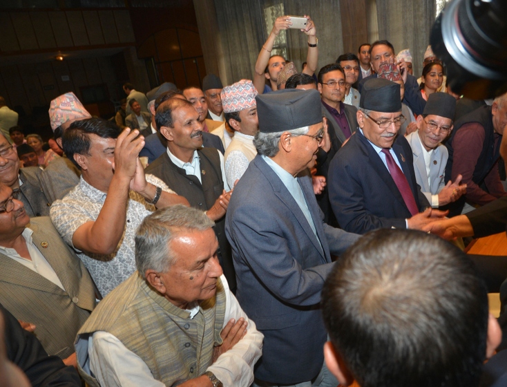 देउवाको उम्मेद्वारी दर्ताः प्रचण्डले तालि बजाउँदा पौडेलले हात लुकाए