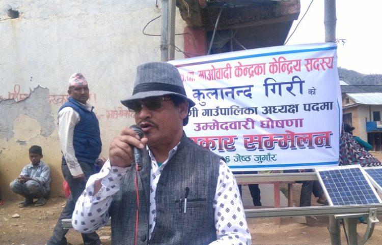 \"\"काठमाडौं, २५ जेठ । नेकपा माओवादी केन्द्रका केन्द्रीय सदस्य कुलानन्द गिरीले पार्टी परित्याग गरेका छन् । बिहिवार काठमाडौं पत्रकार सम्मेलन गरि माओवादी परित्याग गरि स्वतन्त्र बन्ने गिरीले घोषणा गरेका हुन् । पत्रकार सम्मेलनमा गिरीले भने ‘हामी सँगैका साथी हालका उपप्रधान तथा परराष्ट्रमन्त्री कृष्णबहादुर महरा ६ पटक मन्त्री हुँदा म एकपटक गाउँपालिकाको अध्यक्ष हुन् पनि पार्टीले दिएन’ उनले भने ‘त्यसैले मैले राजीनामा दिन बाध्य भएँ ।’ रोल्पाको त्रिवेणी गाउँपालिकाको उम्मेद्वार नबनाएको भन्दै स्वतन्त्रबाट उम्मेद्वारी दिने बताएका छन् । उक्त गाउँपालिकामा अध्यक्ष पदमा माओवादीबाट गंगाराम घर्तीलाई उम्मेदवार बनाउने घोषणा गरिएपछि गिरीले पार्टी परित्याग गरी स्वतन्त्र रुपमा उम्मेदवार बन्ने बताएका हुन् ।
