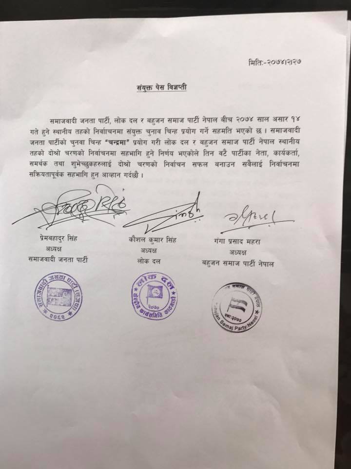 \"\"काठमाडौं, २८ जेठ । समाजवादी जनता पार्टी, लोक दल र बहुजन समाज पार्टीले एउटै चुनाव चिन्ह लिएर दोस्रो चरणको निर्वाचन सहभागि हुने सहमति गरेका छन् । आइतवार समाजवादी पार्टीको चुनाव चिन्ह प्रयोग गरेर लोक दल र महुजन पार्टी चुनाव भाग लिने सहमति गरेका हुन् । तीन वटै दलका अध्यक्षसहितका शीर्ष नेताहरुले यस्तो सहमति गरेका हुन् । समाजवादीका अध्यक्ष प्रेमबहादुर सिंह, लोक दलका अध्यक्ष कौशलकुमार सिंह र बहुजनका अध्यक्ष गंगाप्रसाद महराद्धारा विज्ञप्ति प्रकाशित गर्दै सबैलाई जानकारी गराएका छन् । असार १४ गते हुने भनिएको दोस्रो चरणको स्थानीय तह निर्वाचनमा सक्रिय रुपमा सहभागि हुन दलका नेता, कार्यकर्ता र जनताहरुलाई आव्हान पनि गरेका छन् ।