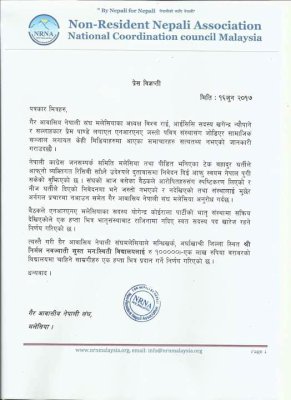 मलेशिया । एनआरएनए मलेशिया आइसिसि सदस्य खगेन्द्र नेपाली, अध्यक्ष विश्व राई र सल्लाहाकार तथा जनप्रगतिशिल मन्च मलेशियाका अध्यक्ष प्रेम पाण्डेमाथि लगाइएको आरोपको एनआरएनए मलेशिया र जनप्रगतिशिल मन्च मलेशियाले खण्डन गरेको छ । [caption id=\"attachment_136587\" align=\"alignleft\" width=\"291\"]\"\" वक्तव्य[/caption] नेपाली कांग्रेस जनसम्पर्क समिति मलेशिया तथा पिडित भनिएका टेक बहादुर घर्तिले नेपाली, राई र पाण्डेको चरित्र हत्या गर्ने उदेश्यले ठगी गरेको भन्दै आरोप लगाएर सामाजिक संजाल तथा विभिन्न संचार माध्यममा आएको समाचार सत्य नभएको बताइएको छ । एनआरएनए मलेशिया तथा जनप्रगतिशिल मन्च मलेशियाले एक वक्तव्य जारी गर्दै आरोप कपोलपल्पित र भ्रमक रहेको र सत्य नभएको बताइएको छ । साथै एनआरएनएका मलेशिया सदस्य योगेन्द्र कोईराला पार्टीको भातृ संस्थामा सक्रिय रहेकोले एक हप्ताभित्र राजिनामा नदिए सदस्य पद स्वत खारेज गर्ने समेत चेतावनी दिइएको छ ।