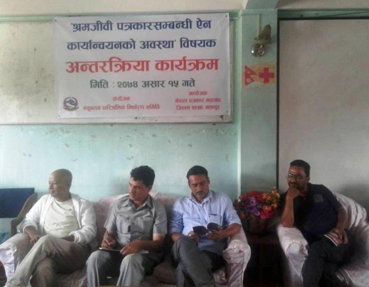 \"\"भक्तपुर, १५ असार । नेपाल पत्रकार महासँघ भक्तपुर शाखाको समन्वयमा न्यूनतम पारिश्रमिक निर्धारण समितिको एक दिने कार्यशाला आज भक्तपुरमा सम्पन्न भएको छ । शाखा अध्यक्ष पुस्करराज बुढाथोकीको सभापतित्वमा भएको कार्यक्रममा समितिका केन्द्रीय सदस्य युवराज विद्रोहीले समितिले श्रमजीवी पत्रकारहरुको पारिश्रमिकका बारेमा उपत्यका लगायत देशभरीका सञ्चारमाध्यममा अनुगमन गरिरहेको बताएका छन् । उनले समितिले पत्रकारहरु हकहित र अधिकारका लागि साउन एक गतेदखि कडाईका साथ समितिले तोके अनुसारको पारिश्रमिकका लागि पहल गर्ने बताए । उक्त कार्यक्रममा पत्रकार कमल न्यौपानेले समितिले बेमौसमी रुपमा अनुगमन गरेर मात्रै ऐनको कार्यान्वयन सम्भव नभएको भन्दै ऐन कार्यान्वयनका लागि समिति प्रभावकारी रुपमा योजनाबद्ध ढंगबाट अघि बढ्नुपर्ने बताए । कार्यक्रममा पत्रकार महासंघका पूर्व केन्द्रीय सदस्य दिलिप थापा मगरले पत्रकारहरुले पनि ऐन कार्यान्वयन र आफना हकहित र अधिकारका लागि निर्धक्क आवाज उठाउनुपर्नेमा जोड दिए । उक्त कार्यक्रममा रफत सञ्चार क्लबका अध्यक्ष सुशिलबन्धु थापा, पत्रकार प्रविण जोशी, शाखाको पूर्व अध्यक्ष विकल श्रेष्ठ, शाखाको उपाध्यक्ष रोशन शिल्पकार, सचिव कृष्ण प्रसाद नेपाल, सदस्य जयराम बास्तोला, नगेन्द्र सापकोटा लगायतले श्रमजीवी पत्रकार ऐन तत्काल कार्यान्वयनमा जोड दिएका थिए । महासँघले असार १५ अर्थात रोपाई दिवसका अवसरमा सहभागीलाई दहि चिउरा समेत खुवाउने कार्यक्रम सम्पन्न गरेको महासँघका कोषाध्यक्ष मोहन बल्लले जानकारी दिए ।