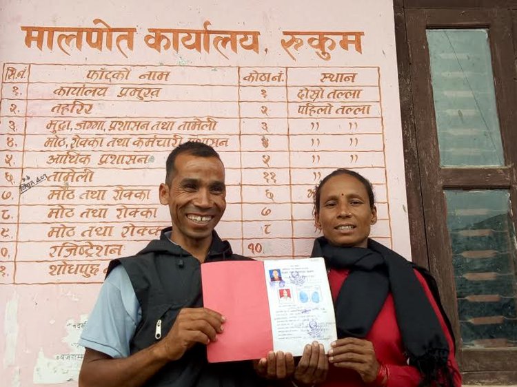 \"\"रुकुम, २३ असार । रुकुमको आठबिसकोट नगरपालिकाका एक जोडीले पहिलोपटक संयुक्त जग्गाधनी पूर्जा बनाएका छन् । घर जग्गामा दुवैको समान अधिकार स्थापित गर्न आठबिसकोट नगरपालिका–११ का लालवीर कामी र विमला कामीले जिल्ला मालपोत कार्यालयमार्फत संयुक्त जग्गाधनी पूर्जा बनाएका हुन् । सरकारले केही वर्ष पहिलेदेखि नै संयुक्त जग्गाधनी पूर्जाको मान्यता दिए पनि यस जिल्लामा भने पहिलोपटक श्रीमान्को नाममा भएको जग्गा श्रीमान् र श्रीमतीको नाममा संयुक्त पूर्जा हुने गरी रजिस्टे«सन गरिएको छ । यहाँ पछिल्लो समय महिलाको नाममा जग्गा रजिस्टेसन गर्नेको सङ्ख्यामा वृद्धि भए पनि अहिलेसम्म कसैले पनि संयुक्त जग्गाधनी पूर्जा बनाएको थिएन । लालवीर र विमलाले पहिलोपटक संयुक्त पूर्जा बनाएको जिल्ला मालपोत कार्यालयका सूचना अधिकारी डिल्ली खड्काले बताएका छन्। सम्पत्तिमा पनि बराबर स्वामित्व बनाउन आफ्नो नाममा रहेको एक हजार वर्ग मिटर क्षेत्रफल जग्गालाई दुवैको नाममा पूर्जा बनाएको लालवीरले बताए । खाद्य सुरक्षित उत्थानशील समुदाय निर्माण परियोजनाअन्तर्गत समुदायमा गठन भएका महिला सशक्तीकरण केन्द्रमा भएको छलफलबाट आफ्नो नाममा पनि सम्पत्ति हुनुपर्ने आफूले थाहा पाएको विमलाले बताएक िछिन् । आफ्नो नाममा पनि जग्गा हुँदा आफूले साँच्चिकै नयाँ जीवन पाएजस्तो अनुभूति गरेको पनि विमलाले बताइन । रासस