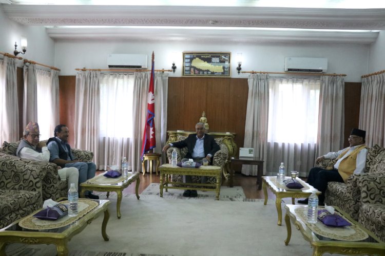 \"\"काठमाडौं, २४ असार । संसदमा दर्ता भएको संविधान संशोधन प्रस्तावमाथि सहमति जुटाउने प्रयासस्वरुप बालुवाटारमा बसेको नेपाली कांग्रेस, माओवादी केन्द्र र राष्ट्रिय प्रजातन्त्र पार्टीका नेताहरुको बैठक सकिएको छ । प्रधानमन्त्री शेरबहादुर देउवाले आब्हान गर्नुभएको बैठकमा संविधान संशोधन प्रस्तावलाई अघि बढाएर तेस्रो चरणको स्थानीय तह निर्वाचन सम्पन्न गर्नेबारे नेताहरुबीच छलफल भएको थियो । छलफलमा कांग्रेस र माओवादीले संविधान संशोधनमा राप्रपाको धारणाबारे चासो राखेका थिए । राप्रपाका नेताहरुले संविधान संशोधन प्रस्तावमा आफूहरु सकारात्मक रहेको जानकारी दिएका थिए । शुक्रबार बसेको कांग्रेस, माओवादी केन्द्र र राजपाका नेताहरुको बैठकमा संविधान संशोधन प्रस्तावलाई निर्णयार्थ पेश गर्ने समझदारी भएपछि आजको बैठक आब्हान गरिएको हो । बैठकमा प्रधानमन्त्री देउवा, पूर्वप्रधानमन्त्री एवं माओवादी केन्द्रका अध्यक्ष प्रचण्ड, राप्रपा अध्यक्ष कमल थापा र राप्रपा नेता पशुपति शमसेर राणा सहभागी थिए ।