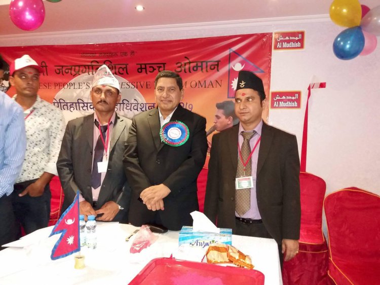 \"\"युएइ । नेकपा माओवादी केन्द्र निकट बिदेश बिभाग सङठन नेपाली जन प्रगतिशील मन्च ओमनको प्रथम महाधिवेशन शुक्रबार भब्य रूपमा सम्पन्न भएको छ । ओमनको गोब्रा स्थित अल रिफ होटेलमा सम्पन्न उक्त महाधिवेशनमा नेपाल बाट प्रमुख अथितिका रूपमा नेकपा माओवादी केन्द्रका बरिस्ठ उपाध्यक्ष तथा बिदेश बिभाग प्रमुख नारायण काजी श्रेष्ठ (प्रकाश )तथा जनबादी गायक नवीन खड्काको उपस्थिति रहेको थियो। अधिवेशन आयोजक समितिका संयोजक पदम प्रसाद अर्यालको अध्यक्षतामा सम्पन्न सो कार्यक्रममा विशिष्ट अतिथीमा नेपालि राजदूतावास ओमनकी महामहिम राजदुत सर्मिला पराजुली ढकाल , उद्योग वाणिज्य महासंघका पुर्ब अध्यक्ष चंण्डिराज ढकाल तथा एन आर एनए मध्यपुर्व संयोजक डिबि क्षेत्री रहेका थिय । कार्यक्रममा ओमन स्थित विभिन्न संघ संस्थाका प्रतिनिधिहरु,पत्रकार तथा विभिन्न छेत्रबाट गयका नेपाली हरुको बाक्लो उपस्थिति रहेको थियो। प्रचार प्रसार समितिका संयोजक तुला गिरीले संचालन गरेको कार्यक्रममा अतिथी गायक नवीन खड्काको सांगितिक प्रस्तुतिले कार्यक्रम निकै रोचक बनाएको थियो । ओमनका विभिन्न छेत्रमा रहेका झन्डै ५ सय भन्दा बढी नेपाली हरुको उपस्थितिमा सम्पन्न कार्यक्रममा मन्चका नबनिर्वाचित अध्यक्षमा उमेश विक सहित २७ सदस्यीय नया केन्द्रिय समिति चयन भएको छ ,। जसमा ,उपाध्यक्ष हेम आचार्य , चक्रमान तामाङ र कमला तामङ रहेका छन भने महासचिवमा समित अधिकारी ,सचिबमा राम सिङ तामङ ,दिपक परियार र इस्वर राना मगर रहेका छन ।यस्तै सह सचिबमा सोभा आचार्य कोसादछ्यमा पन्चराम स्याङ्तान र सह कोसादछ्यमा राम लासिवा रहेका छन । यस्तै सदस्यहरुमा टेक बहादुर कामी ,अर्जुन कार्की ,सुरेस बराली ,स्याम महतो ,रिनामाया ,चित्र बहादुर केसि ,बिभी तामङ ,विशाल सुब्बा ,कमल कटुवाल ,संकर अधिकारी,दिपक परियार ,सीता घिमिरे ,बिक्रम तामङ र अरु दुई जना पछी थप्ने गरि राखियको छ । यस्तै मन्चको नव गठित सल्लाहकार समितिमा तुला गिरि र पदम प्रसाद अर्याल मन्च संरक्षक रहने गरि तोलाकान्त भट्टराई ,ज्ञानेन्द्र खनाल , ईच्छा राई र मुन्ना बाबू परियार लाई सल्लाहकार सदस्यमा राखियको छ । कार्यक्रममा नेपाल बाट आयका प्रमुख अथिती नारायण काजी श्रेष्ठ प्रकाशले नब निर्वाचित सबैलाई बधाई तथा आफ्नो कार्यकाल सफल बनाउन सुभकामना दिदै बिदेशी भुमिमा रहदा समेत पार्टी र देश प्रति सङठनले महत्त्वपूर्ण खेलेको भुमिका भन्दै प्रसम्सा समेत गरेका थिय ।कार्यक्रममा गित सङ्गीत मार्फत मनोरंजन गराउन नेपाल बाट आयका जनवादी गायक नवीन खडकाले सबैलाई विभिन्न गित सङ्गीत मार्फत भरपुर मनोरंजन गरायका थिय । झन्डै ५ घन्टा लामो कार्यक्रममा विभिन्न छेत्र बाट उपस्थित प्रतिनिधि हरुले नब निर्वाचित सम्पुर्