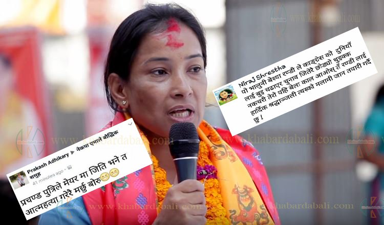 \"\"काठमाडौं । भरतपुर महानगरपालिकाको मेयर पदमा विजयी हुनपूर्व नै नेपाली कांग्रेस–माओवादी केन्द्र गठबन्धनकी उम्मेद्वार रेणु दाहालविरुद्ध सामाजिक सञ्जालमा गाली र अपशब्दको बर्षा नै चल्यो । ताकि अहिले नेकपा एमालेका कार्यकर्ताहरुले सामाजिक सञ्जाल रेणु दाहालविरुद्ध रंग्याएका छन् । त्यसो त उनलाई बधाइ दिनेहरु पनि कम भने छैनन् । \"\" रेणु मेयर पदमा विजयी हुनअघि प्रकाश अधिकारीले सामाजिक सञ्जाल फेसबुकबाट नेकपा एमाले बौद्धिक समूहको गु्रपमा स्ट्याटस पोष्ट गरे ‘प्रचण्ड पुत्रीले मेयरमा जिति भने त आत्महत्या गरेरै मर्छु बरु ।’ यो स्ट्याटस रेणुले जित्नु भन्दा अघि नै पोष्ट गरिएको हो । स्ट्याटस हेर्दा लाग्छ अधिकारी नेकपा एमालेका कार्यकर्ता हुन् । यसरी कसैले जित्यो या हार्यो भने आत्महत्या गर्छ भन्ने जस्ता स्ट्याटसले गर्दा अधिकारी मात्रै होईन अरुले पनि यस्तै सिक्छन् । र, भोलि जो कोहिले पनि आत्महत्या गर्न सक्छ । त्यसैले सामाजिक सञ्जालको दुरुपयोग होईन, सदुपयोग गर्न जरुर छ । त्यसो त रेणु दाहाल मेयरमा विजयी भइसकेपछि निरज श्रेष्ठ नामक फेसबुक एकाउण्टबाट अर्को स्ट्याटस पोष्ट भयो । श्रेष्ठले दाहाललाई अश्लिल शब्द प्रयोग गरेका छन् । उक्त स्ट्याटसमा रेणुलाई श्रदाञ्जलीसमेत दिइएको छ । श्रेष्ठले स्ट्याटसको अन्तिममा लेखेका छन् ‘मलामीको तयारी गर्दैछु ।’ \"\" सामाजिक सञ्जाल अचेल सदुयोग भन्दा दुरुपयोग नै बढि भएको देखिन्छ । कसैलाई गाली गर्नु परे फेसबुक ट्वीटर नै बढि प्रयोग भएको पाइन्छ । कोहि कसैलाई अश्लिल गाली गलौज गर्दा कानु लाग्ने ठान्दा ठान्दै पनि फेसबुकमा समाजमा पच्नै नसक्ने शब्दहरु प्रयोग गरिएको छ । रेणु त एउटा पछिललो उदाहरण हुन् । यसअघि राष्ट्रपति विद्यादेवी भण्डारीविरुद्ध पनि फेसबुकमा अश्लिल शब्द प्रयोग गरेर गाली गर्ने कम थिएनन् । भण्डारीलाई अश्लिल शब्दले गाली गर्नेलाई प्रहरीले प्रक्राउ गरिसकेको छ । तर यसअघि रेणुलाई नै अश्लिल शब्द प्रयोग गर्ने निरब ज्ञवाली भने २५ हजार धरौटीमा छुटिसकेका छन् । भरतपुर महानगरपालिकाको मेयर पदमा एमालेका उम्मद्वार देवी ज्ञवालीलार्इ २०३ मत अन्तर हराउँदै रेणु विजयी भएपछि उनीबिरूद्द सामाजिक सञ्जालमा एमाले कार्यकर्ता खनिएका हुन् । जेठ १४ गते विवादका कारण मतपत्र च्यातिएपछि भरतपुर-१९ मा शुक्रवार मतदान भएको थियो । भरतपुरको मेयरमा माअोवादी नेतृ रेणु दाहाल र उपमेयरमा कांग्रेसकी पार्वती शाह निर्वाचित भएका छन् ।