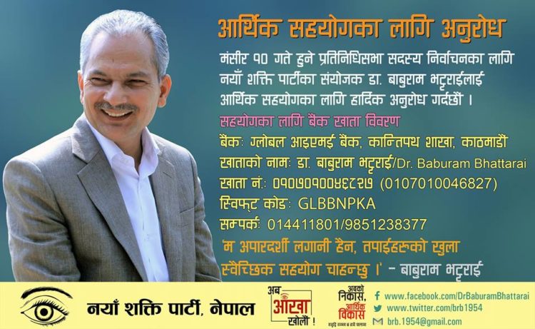 \"\"काठमाडौं । एक पटक अर्थमन्त्री र अर्को पटक प्रधानमन्त्री भइसकेका नयाँ शक्ति पार्टीका संयोजक डा. बाबुराम भट्टराईलाई आर्थिक संकट परेको छ । आसन्न संसदीय निर्वाचनका लागि चुनाव खर्च नभएपछि भट्टराईले सामाजिक सञ्जाल फेसबुकबाटै आर्थिक संकलन अभियान थालेका छन् । निर्वाचनलाई मितव्ययी, स्वच्छ र पारदर्शी बनाउन खुला स्वेच्छिक आर्थिक सहयोगको आग्रह गरेको भट्टराईले फेसबुकमा लेखेका छन् । ‘म अपारदर्शी लगानी होईन, तपाइँहरुको खुला स्वैच्छिक सहयोग चाहन्छु’ भट्टराईले भनेका छन् । रकम जम्मा गरिदिन ग्लोबल आईएमई बैंक कान्तिपथ, काठमाडौं शाखाको खाता नम्बर र स्विफ्ट कोडसमेत दिएका छन् । गृहजिल्ला गोरखा क्षेत्र नम्बर–२ बाट मंसिर १० गते हुन लागेको प्रतिनिधिसभा निर्वाचनमा भट्टराई चुनावी मैदानमा लोकतान्त्रिक गठबन्धनबाट उत्रिएका छन् । त्यस्तै वाम गठबन्धनबाट माओवादीका नेता नारायणकाजी श्रेष्ठ चुनावी मैदानमा उत्रिएका छन् ।