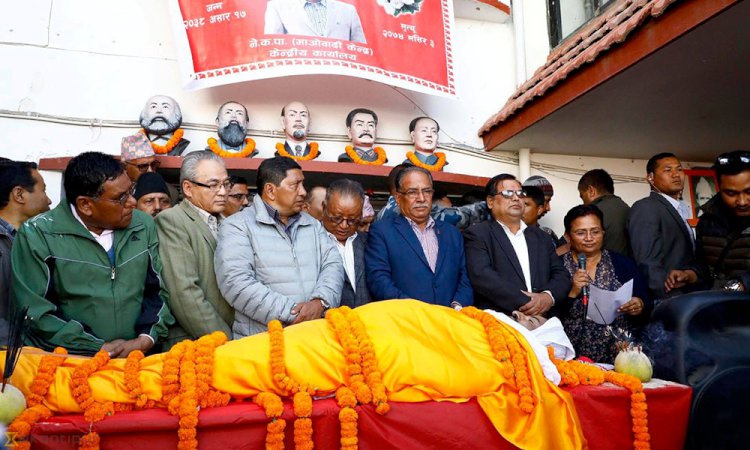 \"\"काठमाडौं । माआवादी केन्द्रका अध्यक्ष पुष्पकमल दाहाल प्रचण्डले छोरा प्रकाश दाहालको पार्थिव शरीरलाई अन्तिम श्रद्धाञ्जली दिँदै पार्टीको झण्डा ओढाएका छन् । \"\"प्रकाशको पार्थिव शरिरलाई आहले माओवादी पार्टी कार्यालय कोटेश्वरको पेरिसडाँडामा राखिएको थियो ।\"\" प्रकाशको आइतबार विहान घरमै हृदयघातका कारण निधन भएको नर्भिक अस्पतालका डाक्टरहरुले बताएका छन् ।\"\"\"\"\"\"