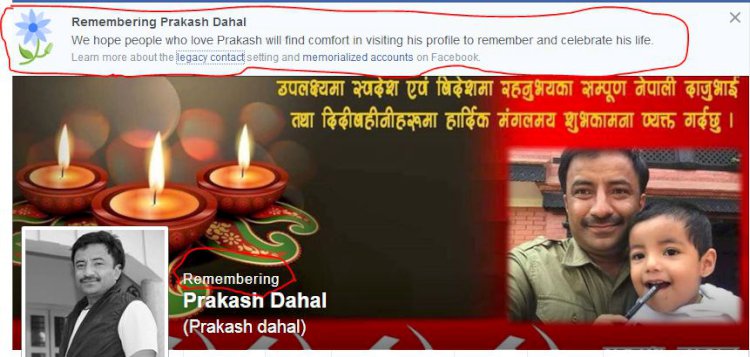 \"\"काठमाडैं । नेबपा माओवादी केन्द्रका अध्यक्ष पुष्पकमल दाहाल प्रचण्डका पुत्र प्रकाश दाहालको मृत्युपछि फेसबुकले उनको अकाउन्टमा ‘रीमेम्बेरीङ प्रकाश दाहाल’ लेखिदिएको छ । उनको निधनको सुचना पाएपछि फेसबुकले उनको अकान्टमा यस्तो लेखिदिएको हो । प्रकाशको निधनपछि उनलाई श्रद्धान्जली दिँदै सामाजिक सञ्जालमा फोटो पोष्ट भएपछि फेसबुकले प्रकाशको निधनको जानकारी पाएको हो । प्रकाशको आइतबार बिहान आकस्मिक हृदयघातमा कारण निधन भएको हो ।