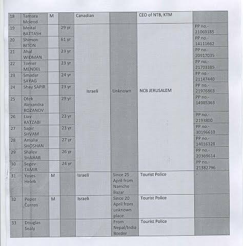 काठमाडौं, नेपाली पुलिसले गत शनिबारको महाभूकम्पमा परि बेपत्ता भएका १६ विदेशी नागरिकको नाम सार्वजनिक गरेको छ  । बेपत्ता १६ नागरिकमध्ये १५ इजराली नागरिक रहेका छन् भने एक क्यानडियन नागरिक रहेका छन् । बेपत्ता धेरैजसो २३ देखि ६१ उमेर समूहका रहेका छन् । \"missing