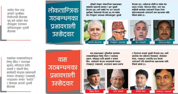 \"\"निर्वाचन नजिकिँदै गर्दा लुम्बिनीका निर्वाचन क्षेत्रले सबैको ध्यान खिचेका छन् । लुम्बिनीका विभिन्न निर्वाचन क्षेत्रमा वाम गठबन्धन र लोकतान्त्रिक गठबन्धनबाट प्रभावशाली नेताले उम्मेदवारी दिएका कारण जिल्लाबाहिरसमेत चर्चा भएको हो । अाजको नयाँ पत्रिकामा खबर छ-साथै मधेसवादी दलका केन्द्रीय नेताले समेत लुम्बिनी क्षेत्रको चुनावी माहोल आफ्नो पक्षमा पार्न निकै गृहकार्य गरिरहेका छन् । यी क्षेत्रमा कडा प्रतिस्पर्धा लुम्बिनीमा सबैभन्दा बढी प्रतिस्पर्धा रुपन्देही ३ मा हुने मतदाताको आँकलन छ । जहाँ एमाले उपमहासचिव घनश्याम भुसाल र कांग्रेसको समर्थनमा राप्रपाका नेता दीपक बोहोरा प्रतिस्पर्धामा छन् । कांग्रेस नेता बालकृष्ण खाणको क्षेत्रसमेत रहेको यहाँ कांग्रेसले राप्रपालाई समर्थन गरेपछि कांग्रेसको एउटा हिस्सा असन्तुष्ट छ । राप्रपा नेता बोहोरा चुनावी खेल राम्रोसँग खेल्ने खेलाडीका रूपमा चर्चामा रहँदै आएको छ । स्थानीय निर्वाचनको परिणामलाई हेर्दा वाम गठबन्धनको मत धेरै रहे पनि वाम गठबन्धनलाई बोहोराको उम्मेदवारी भारी पर्ने स्थानीयको भनाइ छ । उपाध्याय र बलदेवमा को आउट ? कपिलवस्तुमा कांग्रेस नेता दीपकुमार उपाध्याय र माओवादी केन्द्रका नेता चन्द्रप्रकाश खनालमध्ये को विजयी बन्ला भन्ने आँकलन गर्न नसकिने अवस्था छ । दुवै उम्मेदवार राष्ट्रिय राजनीतिमा प्रभाव पार्ने स्तरका भएकाले चुनावी भिडन्त रोचक बन्ने मतदाताको भनाइ छ । यद्यपि, कपिलवस्तु १ बाट उम्मेदवार बनेका यी दुई नेता २१ वैशाखमा हुने मतदानबाट एकजना आउट हुने भने पक्का छ । स्थानीय निर्वाचनलाई आधार मान्ने हो भने वाम गठबन्धनको मत धेरै बढी छ । ज्ञवाली र भण्डारीले तताए गुल्मी लुम्बिनीको अर्को चर्चित निर्वाचन क्षेत्र हो गुल्मी क्षेत्र नम्बर १, जहाँ एमाले सचिव प्रदीप ज्ञवाली र कांग्रेस नेता चन्द्र भण्डारी निर्वाचनको प्रतिस्पर्धामा छन् । वाम गठबन्धन बन्नु र वाम गठबन्धनको मत बढी हुनु भण्डारीका लागि चुनौती बनेको छ । वाम गठबन्धनको सबै मत ज्ञवालीलाई परे उनको जित सुनिश्चित छ । विगतका निर्वाचनमा ज्ञवाली जिल्लामा कम आउने तथा कार्यकर्ता तथा मतदातासँग घुलमिल नहुने आरोप लाग्ने गरेकोमा यसपटक त्यस्तो गुनासो सुनिँदैन । केही समयदेखि ज्ञवाली जिल्लामा बढी आउने तथा मतदाता तथा कार्यकर्तासँग घुलमिल हुने नेतामा पर्छन् । यस्तै भण्डारी पनि मतदातामाझ तथा कार्यकर्तामाझ बढी घुलमिल हुने नेता हुन् । सहज जित हात पार्ने दाउमा वाम गठबन्धनका नेता लुम्बिनीमा जित सहज रहेको दाबी गरिएका वाम गठबन्धनका उम्मेदवारमा एमाले उपमहासचिव विष्णु पौडेल, सचिव गोकर्ण विष्ट र माओवादी केन्द्रका नेता टोपबहादुर रायमाझी हुन् । पौडेल रुपन