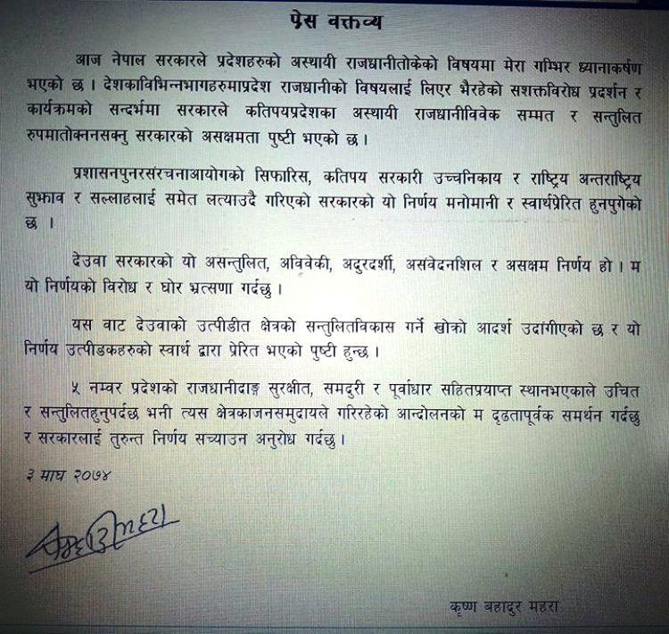 \"\"दाङ । देउवा सरकारले प्रदेश नम्बर ५ को अस्थायी मुकाम रुपन्देहीलाई घोषणा गरेपछि पूर्वउपप्रधानमन्त्री तथा प्रतिनिधि सभाका सदस्य कृष्णबहादुर महराले  गम्भिर ध्यानाकर्षण भएको जनाएका छन् । असक्षम देउवा सरकारले गरेको असन्तुलित र अन्यायपूर्ण निर्णय प्रति गम्भिर ध्यानाकर्षण भएको जनाएउदै नेता महाराले उक्त निर्णयको घोर निन्दा तथा भ्रत्सना समेत गरे । उनले वक्तव्य जारी गर्दै प्रशासन पुनरसंरचना आयोगको सिफारिस, कतिपय सरकारी उच्च निकाय र राष्ट्रिय अन्तराष्ट्रिय सुझाव र सल्लाहलाई समेत लत्याउदै गरिएको सरकारको यो निर्णय मनोमानी र स्वार्थ प्रेरित भएको बताए । ‘देउवा सरकारको यो असन्तुलित, अविवेकी, अदुरदर्शी, असंवेदनशिल र असक्षम निर्णय हो । म यो निर्णयको विरोध र घोर भ्रत्सणा गर्दछु’, वक्तव्यमा भनिएको छ । वक्तव्यमा भनिएको छ–‘ पाँच नम्वर प्रदेशको राजधानी दाङ सुरक्षीत, समदुरी र पूर्वाधारसहित प्रयाप्त स्थान भएकाले उचित र सन्तुुलित हुनु पर्दछ भनी त्यस क्षेत्रका जनसमुदायले गरिरहेको आन्दोलनको म दृढतापूर्वक समर्थन गर्दछु र सरकारलाई तुरुन्त निर्णय सच्याउन अनुरोध गर्दछु ।’ \"\"