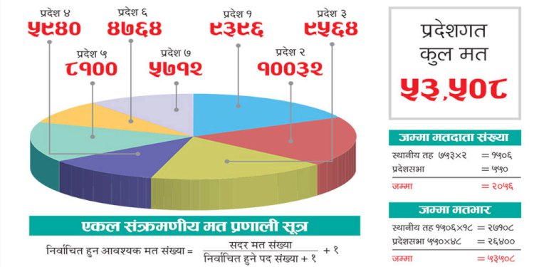 प्रदेश १ का १३७ स्थानीय तहका २७४ र प्रदेश सभा सदस्य ९३ गरी ३६७ मतदाता हुनेछन् । प्रदेश १ मा स्थानीय तहको ४९३२ र प्रदेश सभाको ४४६४ गरी ९३९६ मतभार हुनेछ । प्रदेश २ नेकपा एमाले-३७ नेपाली कांग्रेस-७५ नेकपा माअोवादी केन्द्र-४५ संघीय फोरम-५१ राजपा-५५ अन्य-९ प्रदेश २ मा १३६ स्थानीय तह छन् । जसमा स्थानीय तहबाट २७२ र प्रदेश सभाबाट १०७ गरी ३७९ मतदाता हुनेछन् । प्रदेश २ मा स्थानीय तहको मतभार ४८९६ छ भने प्रदेश सभा सदस्यको मतभार ५१३६ रहेको छ । प्रदेश २ को कुल मतभार १००३२ हुनेछ । प्रदेश २ मा सबैभन्दा बढी मतभार छ । प्रदेश ३ नेकपा एमाले-१३३ नेपाली कांग्रेस-६७ नेकपा माअोवादी केन्द्र-३३ ११९ स्थानिय तह रहेको प्रदेश ३ मा ११० प्रदेश सभा सदस्य छन् । यो प्रदेशमा स्थानीय तहको २३८ र प्रदेश सभाको ११० गरी ३४८ मतदाता रहेका छन् । स्थानीय तहमा ४२८४ र प्रदेश सभा सदस्यमा ५२८० गरी ९५६४ मतभार रहेको छ । प्रदेश ४ नेकपा एमाले-७० नेपाली कांग्रेस-८१ नेकपा माअोवादी केन्द्र-१२ अन्य-७ प्रदेश ४ मा ५ स्थानीय तह रहेका छन् । यो प्रदेशमा स्थानीय तहको १७० र प्रदेश सभाको ६० गरी २३० मतदाता रहेका छन्। स्थानीय तहको ३०६० र प्रदेश सभातर्फ २८० गरी ५९४० मतभार रहेको छ । प्रदेश ५ नेकपा एमाले-९० नेपाली कांग्रेस-६४ नेकपा माअोवादी केन्द्र-४१ संघीय फोरम-११ अन्य-१२ प्रदेश ५ मा १०९ स्थानीय तह रहेका छन् । यो प्रदेशमा स्थानीय तहका २१८ र प्रदेश सभाका ८७ गरी ३०५ मतदाता रहेका छन्। जसमा स्थानीय तहको ३९२४ र प्रदेश सभाको ४१७६ गरी ८१०० मतभार हुनेछ । प्रदेश ६ नेकपा एमाले-५८ नेपाली कांग्रेस-४१ नेकपा माअोवादी केन्द्र-५१ प्रदेश ६ मा स्थानीय तहको १५८ र प्रदेश सभा ४० गरी १९८ मतदाता रहेका छन् । प्रदेश ६ मा ७९ स्थानीय तह रहेका छन् । यो प्रदेशमा स्थानीय तहको २८४४ र प्रदेश सभाको १९२० गरी ४७६४ मतभार रहेको छ । प्रदेश ७ नेकपा एमाले-८३ नेपाली कांग्रेस-७२ नेकपा माअोवादी केन्द्र-१९ अन्य-२ प्रदेश ७ मा ८८ वटा स्थानीय तह रहेका छन् । यो प्रदेशमा स्थानीय तहको १७६ र प्रदेश सभाका ५३ गरी २२९ मतदाता रहेका छन् । प्रदेश ७ मा स्थानीय तहको ३१६ र प्रदेश सभाको २५४४ गरी ५७१२ मतभार रहेको छ ।
