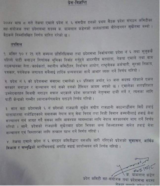 \"\"वीरेन्द्रनगर। नेकपा माओवादी केन्द्रले सुरुबाटै दाबी गरेको ६ नम्बर प्रदेशको मुख्यमन्त्री नेकपा एमालेले नछाड्ने भएको छ । सोमबार वीरेन्द्रनगरमा बसेको ६ नम्बर प्रदेशको संसदीय दलको बैठकले यस्तो निर्णय गरेको हो । अन्य प्रदेशको तुलनामा माओवादीको प्रदेश ६ मा पक्कड हो । एमालेका पोलिटव्यूरो सदस्य तथा प्रदेश नं ६ का सहसंयोजक यामलाल कंडेलको अध्यक्षतामा भएको संसदीय दलको बैठकपछि जारी विज्ञप्तिमा भनिएको छ ‘ प्रदेश ६ मा एक्लै सरकार बनाउन सक्ने सदस्य संख्या आफूहरुसँग भएको भन्दै प्रदेश नं ६ माओवादीका लागि नछोड्ने उल्लेख छ । २० सिट जितेको भन्दै बैठकले प्रदेशको नेतृत्व दावी गर्ने निर्णय गरेको हो । \"\"